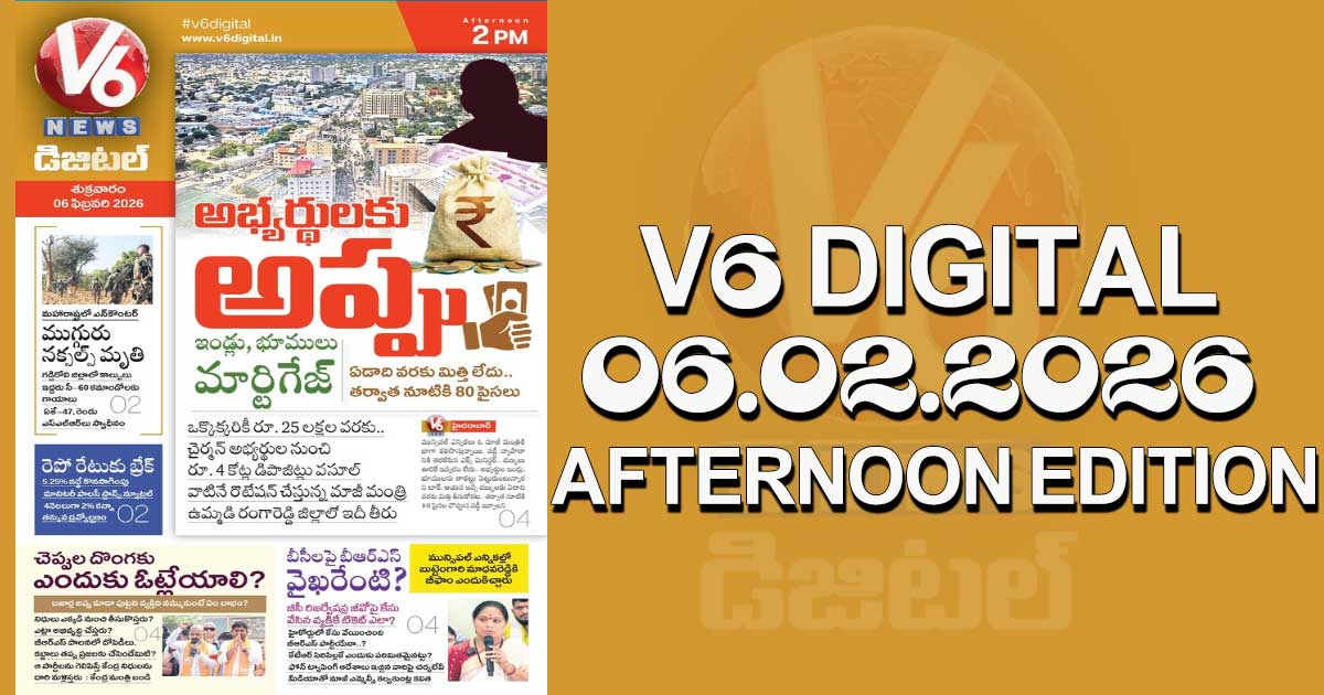 Reading Time: < 1 minute V6 DIGITAL 06.02.2026 AFTERNOON EDITION Caption of Image. అభ్యర్థులకు అప్పు.. ఇండ్లు, జాగాలు తనాఖా..మాజీ మంత్రి తీరిది బీసీ రిజర్వేషన్లకు వ్యతిరేకంగా కేసు వేసిన వ్యక్తికే బీఆర్ఎస్ టికెట్టా: కవిత మహారాష్ట్రలో ఎన్ కౌంటర్ ముగ్గురు మావోయిస్టుల మృతి ఇంకా మరెన్నో.. క్లిక్ చేయండి Post navigation ఆన్లైన్ మోసాల బాధితులకు RBI అండ.. ఇకపై రూ.25వేల పరిహారం..! బీఆర్ఎస్ హయాంలో సింగరేణి నిధులు సిరిసిల్ల, సిద్దిపేటకు తరలించారు : మంత్రి వివేక్ వెంకటస్వామి