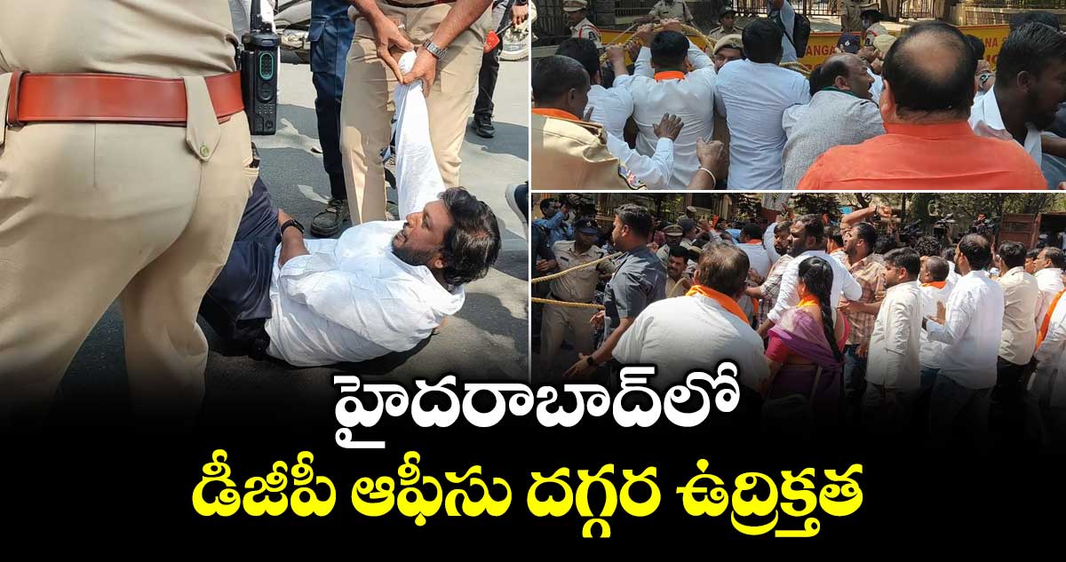 హైదరాబాద్ లోని డీజీపీ ఆఫీసు దగ్గర ఉద్రిక్తత నెలకొంది. నారాయణపేట జిల్లా మక్తల్ మున్సిపాలిటీ ఆరో వార్డు బీజేపీ అభ్యర్థి ఎరుకలి మహాదేవప్ప ఆత్మహత్యకు నిరసనగా రాష్ట్ర బీజేపీ డీజీపీ ఆఫీసు ముట్టడికి యత్నించింది. దీంతో లక్డీకపూల్ లోని డీజీపీ ఆఫీసు దగ్గరకు బీజేపీ కార్యకర్తలు భారీగా తరలివచ్చారు. డీజీపీ కార్యాలయంలోకి చొచ్చుకుని వెళ్లేందుకు యత్నించారు భారీ కేడ్లపై దూకేందుకు యత్నించారు.దీంతో పోలీసులు వారిని అడ్డుకున్నారు. పలువురు బీజేపీ కార్యకర్తలను అదుపులోకి తీసుకుని పీఎస్ కు తరలించారు.