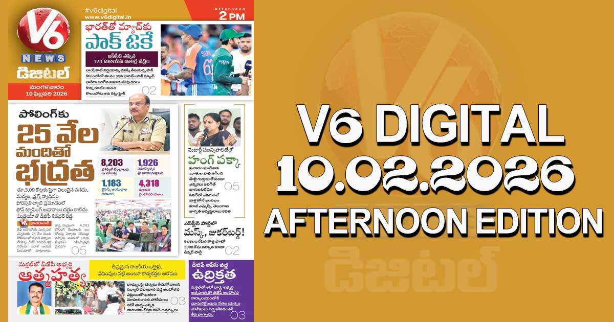 Reading Time: < 1 minute V6 DIGITAL 10.02.2026 AFTERNOON EDITION Caption of Image. భారత్ తో మ్యాచ్ కు పాక్ ఓకే.. కొలంబో ఫ్లైట్ టికెట్ రేట్లు హైక్ మక్తల్ లో బీజేపీ అభ్యర్థి ఆత్మహత్య. ఆ వార్డులో పోలింగ్ వాయిదా మెజార్టీ మున్సిపాలిటీల్లో హంగ్.. మాజీ ఎమ్మెల్సీ కవిత కీలక వ్యాఖ్యలు ఇంకా మరెన్నో.. క్లిక్ చేయండి Post navigation వనస్థలిపురంలో లారీని ఢీ కొట్టిన అంబులెన్స్.. అన్నంత పని చేసిన కాంగ్రెస్: స్పీకర్ ఓం బిర్లాపై అవిశ్వాసం తీర్మానం
