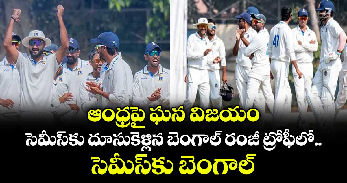 కళ్యాణి (వెస్ట్ బెంగాల్): ఆల్రౌండ్ షోతో ఆకట్టుకున్న బెంగాల్.. రంజీ ట్రోఫీలో సెమీఫైనల్ బెర్త్ను ఖాయం చేసుకుంది. మంగళవారం ముగిసిన క్వార్టర్ఫైనల్లో బెంగాల్ ఇన్నింగ్స్ 90 రన్స్ తేడాతో ఆంధ్రపై విజయం సాధించింది. 64/3 ఓవర్నైట్ స్కోరుతో ఐదో రోజు ఆట కొనసాగించిన ఆంధ్ర రెండో ఇన్నింగ్స్లో 72.2 ఓవర్లలో 244 రన్స్కే ఆలౌటైంది.