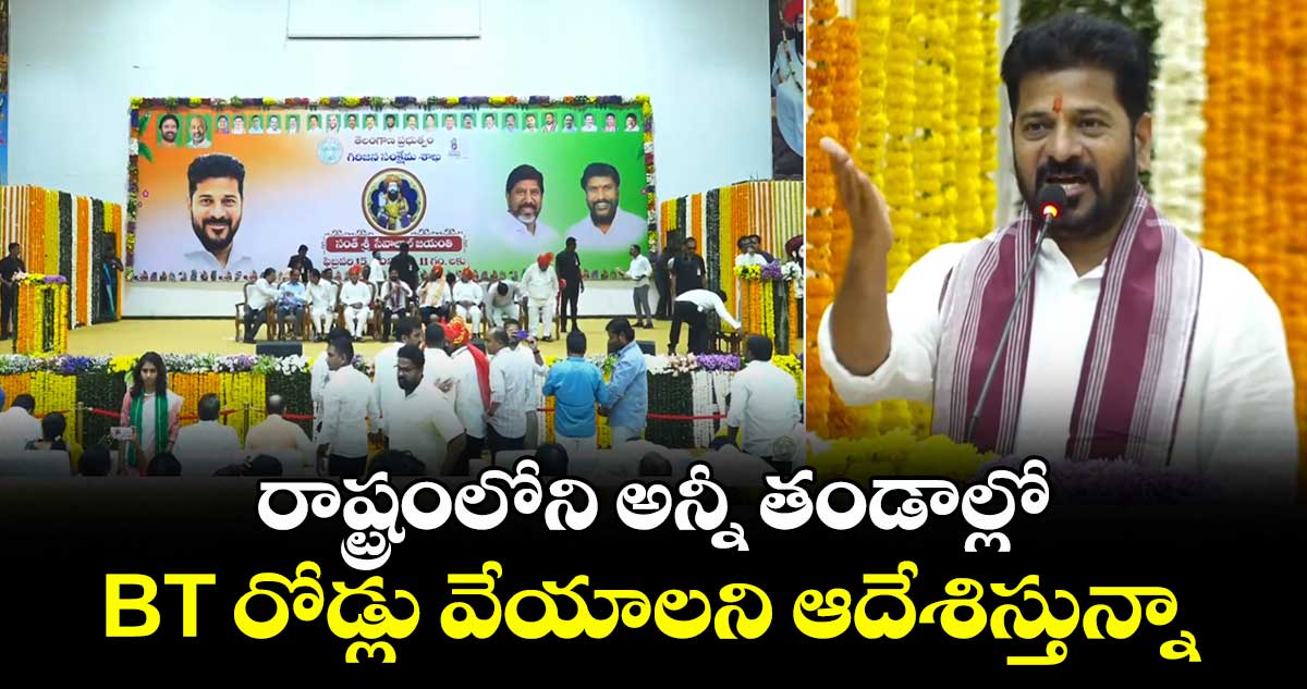 హైదరాబాద్: తెలంగాణలో ఉన్న అన్ని తండాలకు బీటీ రోడ్లు వేయాలని మంత్రి అడ్లూరి లక్ష్మణ్, ట్రైబల్ సెక్రటరీని సీఎం రేవంత్ రెడ్డి ఆదేశించారు. అన్ని గ్రామ పంచాయతీలకు భవనాలు నిర్మించడానికి ప్రణాళిక సిద్ధం చేయాలని సూచించారు. కొన్ని తండాలకు ఇప్పటికీ కూడా తాగునీరు, కరెంట్ రావట్లేదన్నారు. గిరిజన సంక్షేమం కోసం కాంగ్రెస్ ప్రజా ప్రభుత్వం కట్టుబడి ఉందని పేర్కొన్నారు. ఆదివారం (ఫిబ్రవరి 15) బంజారాహిల్స్లోని బంజారా భవన్లో గిరిజన సంక్షేమ శాఖ ఆధ్వర్యంలో సంత్ శ్రీ సేవాలాల్ 287వ జయంతి ఉత్సవాలు నిర్వహించారు.