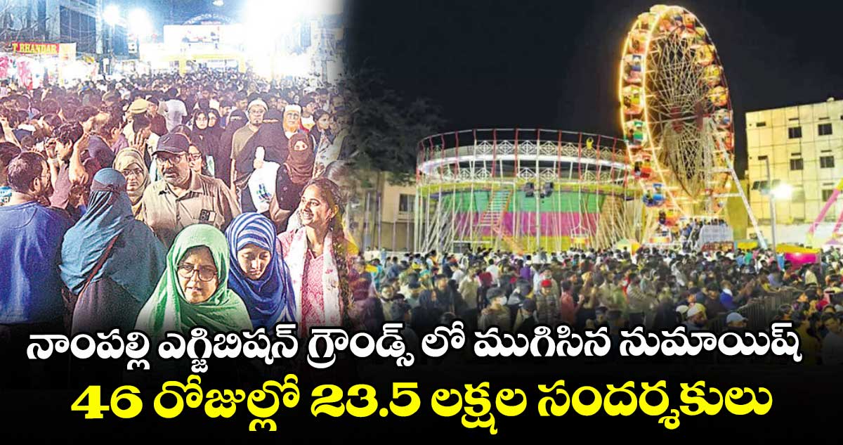 బషీర్బాగ్, వెలుగు: నాంపల్లి ఎగ్జిబిషన్ గ్రౌండ్స్లో నిర్వహించిన 85వ నుమాయిష్ ఆదివారంతో ముగిసింది. 46 రోజుల పాటు సాగిన నుమాయిష్ను 23.50 లక్షల మందికి పైగా సందర్శించారు. చివరి రోజున లక్ష మంది వరకు వచ్చారు. గత సంవత్సరంతో పోలిస్తే ఈసారి 3 లక్షల మందికి పైగా అదనంగా వచ్చినట్లు ఎగ్జిబిషన్ సొసైటీ ఉపాధ్యక్షుడు ఆర్.సుఖేష్ రెడ్డి, కార్యదర్శి బీఎన్ రాజేశ్వర్ తెలిపారు. సుమారు 1,100 స్టాల్స్తో నిర్వహించిన ఈ ప్రదర్శనను తిలకించేందుకు నగరంతో పాటు ఇతర జిల్లాలు, రాష్ట్రాలు, విదేశాల నుంచి వచ్చారు.