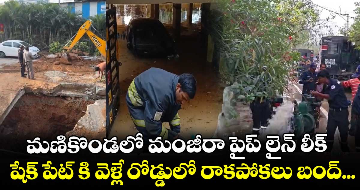మణికొండలో మంజీరా పైప్ లైన్ బ్లాస్ట్ అవ్వడంతో పలు అపార్టుమెంట్ల సెల్లార్లలోకి భారీగా నీరు వచ్చి చేరింది. ఈ క్రమంలో మణికొండ నుంచి షేక్ పేట్ కి వెళ్లే దారిలో రాకపోకలు బంద్ అవ్వడంతో జనం తీవ్ర ఇబ్బంది ఎదుర్కుంటున్నారు. ఇందుకు సంబంధించి వివరాలిలా ఉన్నాయి.. మంగళవారం ( ఫిబ్రవరి 17 ) అర్థరాత్రి మణికొండలో మంజీరా పైప్ లైన్ లీక్ అవ్వడంతో పలు అపార్టుమెంట్ల సెల్లార్లలోకి భారీగా వరద నీరు వచ్చి చేరింది.