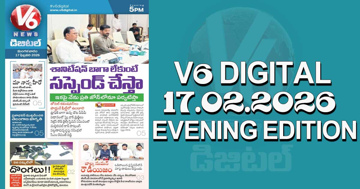 Reading Time: < 1 minute V6 DIGITAL 17.02.2026 EVENING EDITION Caption of Image. అక్కడికక్కడే సస్పెండ్ చేస్తానంటున్న సీఎం.. ఎవరిని.. ఎందుకు? ఓటమి ఫ్రస్ట్రేషన్ లో బాల్కసుమన్ రౌడీయిజం చేశారన్న మంత్రి వివేక్ ఏఐ సమ్మిట్ లో దొంగలు..విలువైన పరికరాలు మాయం..! ఇంకా మరెన్నో.. క్లిక్ చేయండి Post navigation ఐబొమ్మ రవికి బెయిల్.. కానీ ఒక కండీషన్ ! అల్లు అర్జున్కి క్షమాపణలు చెప్పిన కావేరి బారువా… తప్పును ఒప్పుకుంటూ పోస్ట్!