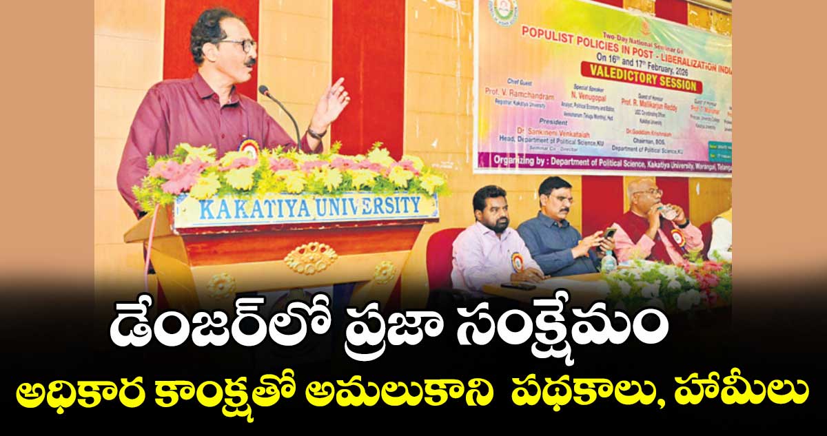 హసన్పర్తి, వెలుగు: దేశ, రాష్ట్ర రాజకీయాల్లో అధికార కాంక్షతో అమలుకాని హామీలు, పథకాలు ప్రవేశపెడుతూ ప్రజాసంక్షేమాన్ని విస్మరిస్తున్నారని ప్రముఖ రాజకీయ, ఆర్థిక విశ్లేషకుడు, ‘వీక్షణం’ ఎడిటర్ ఎన్. వేణుగోపాల్ అన్నారు. మంగళవారం కాకతీయ యూనివర్సిటీలో పొలిటికల్ సైన్స్ విభాగం ఆధ్వర్యంలో నిర్వహించిన జాతీయ సెమినార్లో ఆయన మాట్లాడారు.
