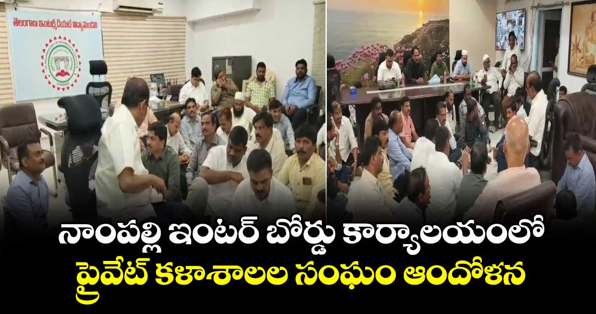 హైదరాబాద్: నాంపల్లిలోని ఇంటర్ బోర్డు కార్యాలయంలో తెలంగాణ ప్రైవేట్ జూనియర్ కళాశాల యాజమాన్య సంఘం ఆందోళనకు దిగింది. బుధవారం (ఫిబ్రవరి 18) ఇంటర్ బోర్డు కార్యదర్శి కృష్ణ ఆదిత్య ఛాంబర్లో బైఠాయించారు సంఘం నాయకులు. 400 మంది విద్యార్థులకు పరీక్ష ఫీజు చెల్లించే అవకాశం కల్పించకుండా ఇంటర్ బోర్డు విద్యార్థుల జీవితాలో చెలగాటమాడుతోందని ఆగ్రహం వ్యక్తం చేశారు.