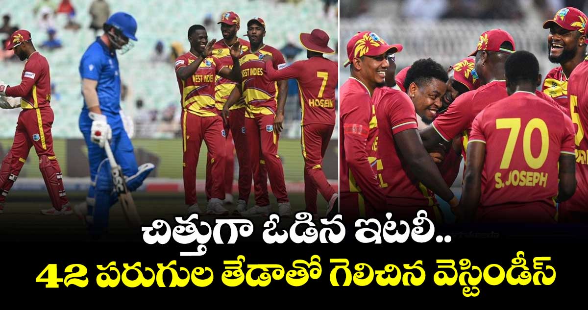 T20 World Cup: టీ20 వరల్డ్ కప్ లో భాగంగా కోల్కతాలోని ఈడెన్ గార్డెన్స్లో గ్రూప్–సీలో భాగంగా ఇటలీతో జరిగిన మ్యాచ్ లో వెస్టిండీస్ ఘన విజయం సాధించింది. టాస్ గెలిచిన ఇటలీ టీం బౌలింగ్ తీసుకుంది. దీంతో మొదట బ్యాటింగ్ చేసిన వెస్టిండీస్ జట్టు ఆరంభంలో బాగానే ఆడినా, మధ్య ఓవర్లలో ఇటలీ బౌలర్ల ధాటికి పరుగులు చేయలేకపోయింది. బౌలర్లు క్రమం తప్పకుండా వికెట్లు తీస్తూ కరేబియన్ జట్టును ఒత్తిడిలోకి నెట్టారు. విండీస్ కెప్టెన్ షాయ్ హోప్ (75) ఒక్కడే జట్టును ఆదుకున్నాడు. చివర్లో రోస్టన్ చేజ్ (24), షెర్ఫేన్ రూథర్ఫోర్డ్ (24) ఫర్వాలేదనిపించారు. నిర్ణీత 20 ఓవర్లలో వెస్టిండీస్ బ్యాటర్లు 6 వికెట్ల నష్టానికి 165 పరుగులు మాత్రమే చేశారు. టోర్నమెంట్లో ఇప్పటివరకు వెస్టిండీస్ చేసిన స్కోర్లలో ఇది అతి తక్కువ స్కోర్ అని చెప్పాలి.