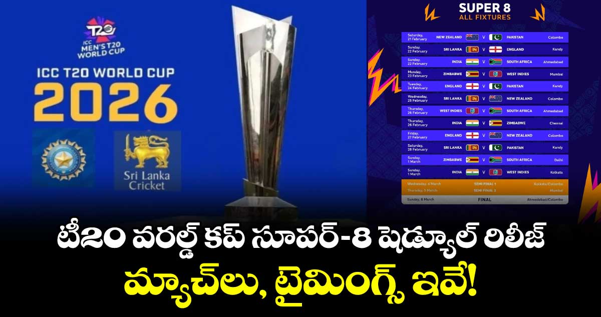 T20 World Cup: టీ20 వరల్డ్ కప్ 2026 గ్రూప్ దశ ముగియడంతో పాటు మెగా టోర్నమెంట్ నుంచి ఆస్ట్రేలియా జట్టు నిష్క్రమించింది. డిఫెండింగ్ ఛాంపియన్ హోదాలో భారత్ మాత్రం అజేయంగా సూపర్–8 దశకు అర్హత సాధించింది. , టోర్నీలో కీలకమైన సూపర్–8 రౌండ్కు సంబంధించిన పూర్తి షెడ్యూల్ను ICC అధికారికంగా రిలీజ్ చేసింది. ఇప్పుడు అసలు పోరు ప్రారంభం కానుంది. సూపర్–8 దశలో ఎనిమిది జట్లను రెండు గ్రూప్స్ గా విభజించబడ్డాయి. గ్రూప్–1లో డిఫెండింగ్ ఛాంపియన్ భారత్తో పాటు జింబాబ్వే, దక్షిణాఫ్రికా, వెస్టిండీస్ ఉండగా.. మరోవైపు గ్రూప్–2లో శ్రీలంక, పాకిస్థాన్, న్యూజిలాండ్, ఇంగ్లాండ్ల మధ్య హోరాహోరీ పోరు జరగనుంది.