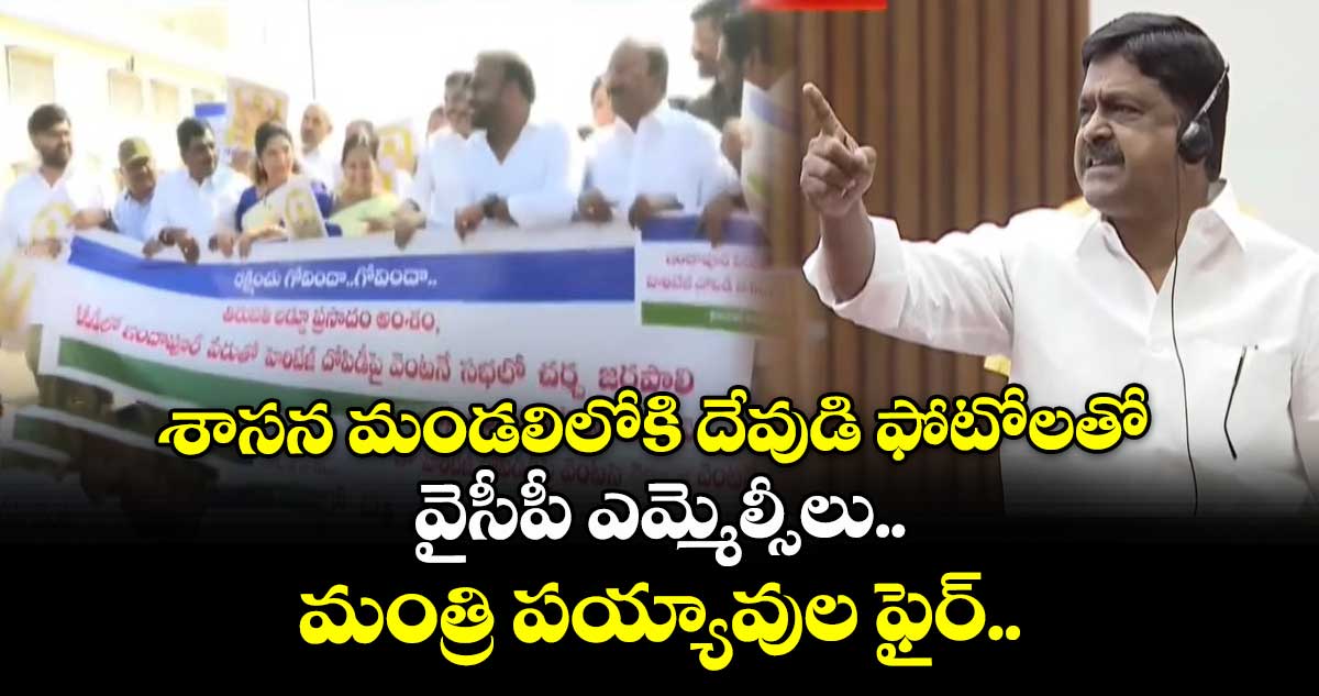 వైసీపీ ఎమ్మెల్సీలు దేవుడి ఫోటోలు ఉన్న ప్లకార్డులు పట్టుకొని రావడాన్ని తప్పుబట్టారు టీడీపీ నేతలు. వైసీపీ ఎమ్మెల్సీల తీరుపై తీవ్రస్థాయిలో మండిపడ్డారు మంత్రి పయ్యావుల కేశవ్. సభలో వెంకటేశ్వర స్వామిని తీసుకురావడాన్ని స్పీకర్ అనుమతించొద్దని అన్నారు. వైసీపీ సభ్యులకు దేవుడంటే నమ్మకం, భయం, గౌరవం లేదని అన్నారు.