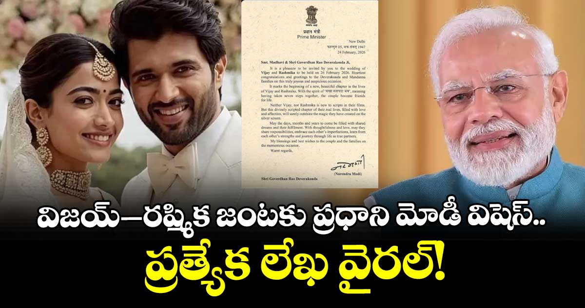 విజయ్ దేవరకొండ-రష్మిక మందన్న కుటుంబాలకు పీఎం మోడీ హృదయపూర్వక అభినందనలు తెలిపారు. ఈ వివాహం వారి జీవితాల్లో “అందమైన కొత్త అధ్యాయం” ప్రారంభమవుతుందన్నారు. సప్తపది అనే పవిత్ర సంప్రదాయంలో భాగంగా ఏడడుగులు కలిసి వేస్తూ జీవితాంతం స్నేహితులు, భాగస్వాములుగా మారుతున్న ఈ క్షణం ఎంతో విశిష్టమని వెల్లడించారు.