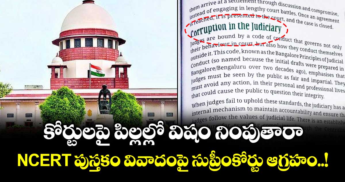 NCERT ప్రచురించిన 8వ తరగతి పుస్తకంలో న్యాయవ్యవస్థ అవినీతి ప్రస్తావనపై సుప్రీంకోర్టు ఆగ్రహం వ్యక్తం చేసింది. న్యాయవ్యవస్థపై విద్యార్థుల్లో విషం నింపుతారా.. విద్యార్థులకు బోధించే పాఠ్యాంశాల్లో న్యాయవ్యవస్థను కించపర్చేలా పాఠ్యాశాలు పెట్టమేంటని ప్రశ్నించింది. ‘‘ఇది సీరియస్ గా తీసుకోవాల్సిన విషయం. న్యాయవ్యవస్థ ను ఎవరు కించపర్చినా చర్యలు తప్పవు అన్నారు.