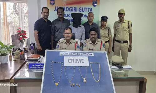 బయటకు వెళ్తూ ఇంటి తాళం ఇంటి ప్రాంతాల్లో దాచి వెళ్లడంతో దొంగల పని సులభం అయింది. అదను చూసి ఇంట్లోకి ప్రవేశించి 14 తులాల బంగారు ఆభరణాలను దోచుకొని ఉడయించిన ఘటన జగద్గిరిగుట్ట పోలీస్ స్టేషన్ పరిధిలోని ఎల్లమ్మబండలో వెలుగు చూసింది. జగద్గిరిగుట్ట డిటెక్టివ్ ఇన్ స్పెక్టర్ నరేందర్ రెడ్డి తెలిపిన వివరాల ప్రకారం.. ఎల్లమ్మబండ దత్తాత్రేయ కాలనీకి చెందిన రేకపల్లి లక్ష్మి (63) ఈ నెల 23న సాయంత్రం సమయంలో ఇంటికి తాళం వేశారు. ఆ తాళం చెవిని తలుపు పక్కనే ఉన్న డ్రమ్ కింద దాచి బయటకు వెళ్లారు. అయితే ఆమె తాళం దాస్తున్న విషయాన్ని అదే కాలనీకి చెందిన పత్రో శంకర్ (36) గమనించాడు. ఆమె వెళ్లగానే నిందితుడు డ్రమ్ కింద ఉన్న తాళంతో తలుపులు తీసి లోపలికి ప్రవేశించాడు. టీవీ టేబుల్పైనే ఉన్న అల్మారా తాళం చెవులతో లాకర్ను తెరిచి అందులోని సుమారు 14 తులాల బంగారు నగలను దొంగిలించి పరారయ్యాడు.