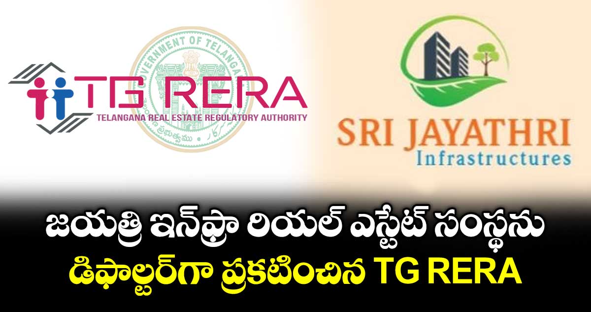 హైదరాబాద్: జయత్రి ఇన్ఫ్రాస్ట్రక్చర్స్ ఇండియా ప్రైవేట్ లిమిటెడ్ రియల్ ఎస్టేట్ సంస్థను తెలంగాణ రియల్ ఎస్టేట్ రెగ్యులేటరీ అథారిటీ (TG RERA) రెరా డిఫాల్టర్గా ప్రకటించింది. దుండిగల్, బౌరంపేట్లో జయ ప్లాటినమ్ ప్రాజెక్ట్ పేరుతో జయత్రి ఇన్ఫ్రా 66 శాతం కట్టి వదిలేసింది.