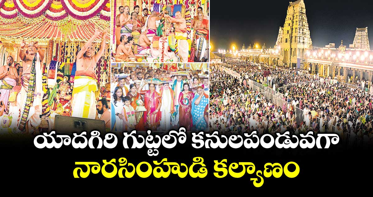 ప్రధానార్చకులు కాండూరి వెంకటాచార్యులు, సురేంద్రాచార్యులు ఆధ్వర్యంలో అర్చకులు వేదమంత్రాలు పఠిస్తూ జీలకర్రబెల్లం, కన్యాదానం తర్వాత తులా లగ్న ముహూర్తంలో మాంగల్యధారణ జరిపించారు. అనంతరం స్వామి అమ్మవార్ల తలంబ్రాల వేడుకను నిర్వహించారు. స్వామి వారి కల్యాణాన్ని వీక్షించేందుకు భక్తులు భారీ సంఖ్యలో తరలివచ్చారు. స్వామి వారి కల్యాణంలో గవర్నర్ జిష్ణు దేవ్ వర్మ సతీమణి సుధ, భువనగిరి ఎంపీ చామల కిరణ్కుమార్రెడ్డి, కలెక్టర్ హనుమంతరావు, అడిషనల్ కలెక్టర్ భాస్కర్రావు, ఆర్డీవో కృష్ణారెడ్డి, యాదగిరిగుట్ట మున్సిపల్ చైర్పర్సన్ గుండ్లపల్లి వాణీభరత్గౌడ్ పాల్గొన్నారు. బ్రహ్మోత్సవాల్లో భాగంగా స్వామివారిని బుధవారం ఉదయం 9 గంటలకు శ్రీరామచంద్రుడి అలంకారంలో హనుమంత వాహనంపై ఊరేగించారు. అనంతరం ప్రధానాలయ తూర్పు రాజగోపురం ఎదుట అధిష్ఠింపజేసి అలంకార విశిష్టతను వివరించారు. బ్రహ్మోత్సవాలకు తరలివచ్చే భక్తుల కోసం పలు ప్రభుత్వ, ప్రైవేట్ హాస్పిటల్స్, స్వచ్ఛంద సంస్థల ఆధ్వర్యంలో ఉచిత మెడికల్ క్యాంప్లను ఏర్పాటు చేశాయి. స్వామివారి కల్యాణం సందర్భంగా ఎలాంటి ఇబ్బందులు తలెత్తకుండా ముగ్గురు డీఎస్పీలు, ఎనిమిది మంది సీఐలు, 20 మంది ఎస్సైలతో మొత్తం 200 మందితో కట్టుదిట్టమైన భద్రత కల్పించారు. బ్రహ్మోత్సవాల్లో భాగంగా కొండపైన నిర్వహిస్తున్న పలు రకాల సాంస్కృతిక, ధార్మిక, సంగీత, సాహిత్య కార్యక్రమాలను భక్తులను విశేషంగా అలరించారు. పలువురు చిన్నారులు చేసిన కూచిపూడి, భరతనాట్యం ప్రదర్శనలు ఆకట్టుకున్నాయి.