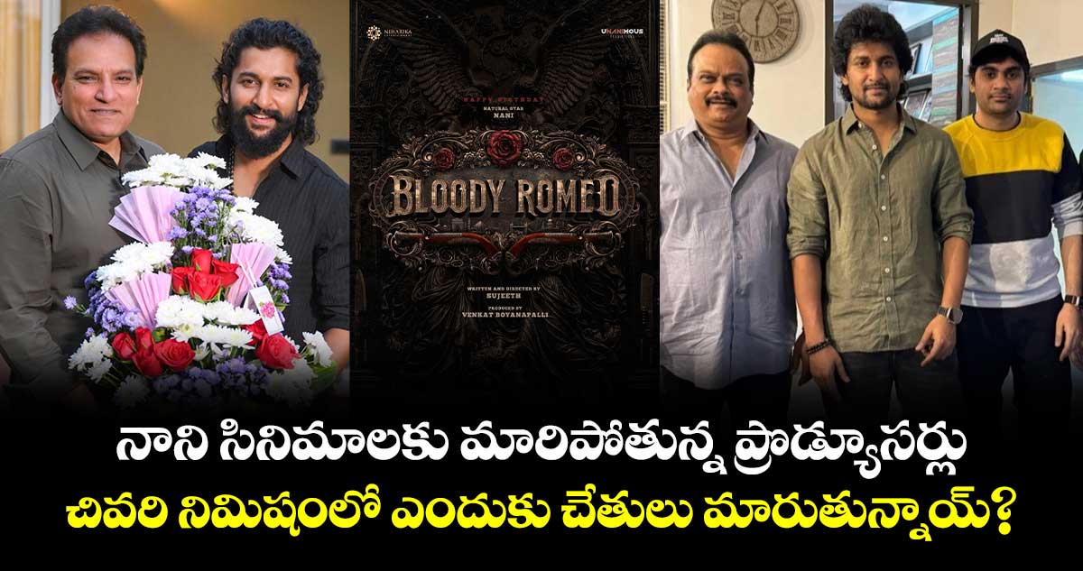 బ్లడీ రోమియో: లేటెస్ట్గా నాని–సుజీత్ కాంబోలో రూపొందుతున్న బ్లడీ రోమియో విషయంలో కూడా నిర్మాత మారినట్లు సమాచారం. నానితో సరిపోదా శనివారం, సుజీత్తో OG లాంటి హిట్ సినిమాలు అందించిన డీవీవీ దానయ్య ఈ సినిమాను నిర్మిస్తున్నారని మొదట పూజా కార్యక్రమాలు జరిగాయి. ‘NANI 32’ వీడియో కూడా డీవీవీ ఎంటర్టైన్మెంట్స్ నుంచి విడుదల కావడంతో ఫ్యాన్స్ కూడా అదే ఫిక్స్ అయ్యారు.