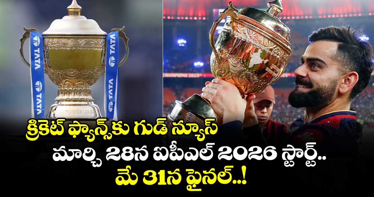న్యూఢిల్లీ: ఇండియన్ ప్రీమియర్ లీగ్ (IPL) కోసం ఎదురు చూస్తోన్న క్రికెట్ ఫ్యాన్స్కు గుడ్ న్యూస్. ఐపీఎల్ 2026 సీజన్ మార్చి 28 నుంచి ప్రారంభం కానున్నట్లు తెలుస్తోంది. మే 31న ఫైనల్ మ్యాచ్ జరగనున్నట్లు సమాచారం. ఐపీఎల్ 2026 సీజన్ మార్చి 26న మొదలు అవుతుందని మొదట ప్రచారం జరిగిన విషయం తెలిసిందే.