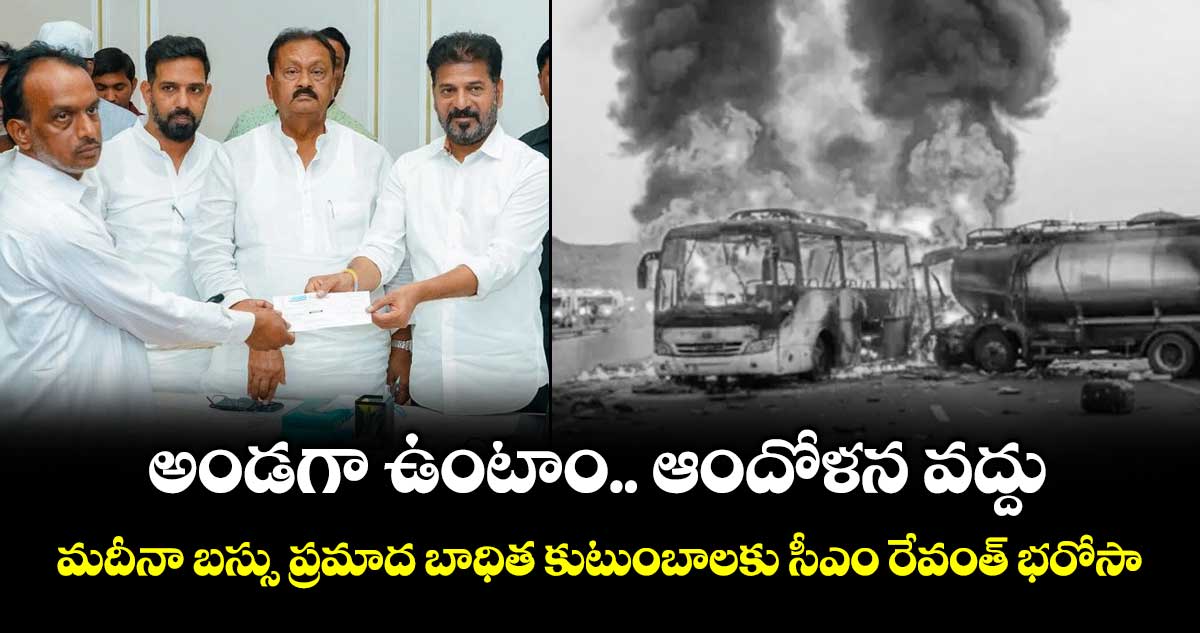 హైదరాబాద్, వెలుగు: ‘‘ఈ ప్రభుత్వం మీది.. ఎలాంటి ఆందోళన చెందాల్సిన పని లేదు.. మీకు అన్నివిధాలా అండగా ఉంటాం’’ అని మదీనా బస్సు ప్రమాద బాధిత కుటుంబాలకు సీఎం రేవంత్ రెడ్డి భరోసా ఇచ్చారు. శనివారం సెక్రటేరియెట్లో బాధిత కుటుంబ సభ్యులతో సీఎం రేవంత్ రెడ్డి సమావేశం అయ్యారు. ప్రమాదంలో మృతిచెందిన 44 మంది కుటుంబాలకు రూ.5 లక్షల చొప్పున, తీవ్రంగా గాయ పడిన వారి కుటుంబాలకు రూ.3 లక్షల చొప్పున చెక్కులను పంపిణీ చేశారు.