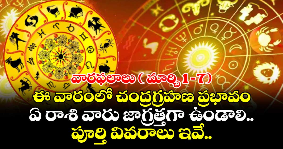 వారఫలాలు ( మార్చి 1–7): జ్యోతిష్య నిపుణులు తెలిపిన వివరాల ప్రకారం.. ఈ వారంలో మార్చి 3 వ తేదీన చంద్రగ్రహణం ఏర్పడనుంది. దీని ప్రభావం అన్ని రాశులపై ఉంటుంది. గ్రహణం ఎఫెక్ట్తో ఈ వారం 12 రాశుల వారి వ్యక్తిగత జీవితానికి సంబంధించి ఎలా ఉండబోతుందో తెలుసుకుందాం. . .!