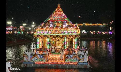 తిరుపతి: తిరుమలలో ఐదు రోజుల పాటు జరిగిన శ్రీవారి వార్షిక తెప్పోత్సవాలు సోమవారం ఘనంగా ముగిశాయి. చివరి రోజు శ్రీ మలయప్పస్వామివారు శ్రీదేవి, భూదేవి సమేతంగా తెప్పపై విహరించి భక్తులకు కనువిందు చేశారు. ముందుగా స్వామి, అమ్మవార్ల ఉత్సవమూర్తులను శ్రీవారి నాలుగు మాడ వీధుల్లో ఊరేగించి శ్రీవారి పుష్కరిణి వద్దకు తీసుకొచ్చారు.