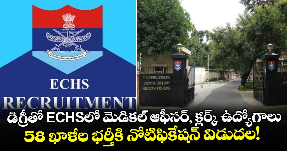 ఎక్స్ సర్వీస్మన్ కాంట్రిబ్యూటరీ హెల్త్ స్కీమ్ (ఈసీహెచ్ఎస్) మెడికల్ ఆఫీసర్, క్లర్క్ , ఇతర పోస్టుల భర్తీకి నోటిఫికేషన్ విడుదల చేసింది. ఆసక్తి, అర్హత గల అభ్యర్థులు ఆన్లైన్లో అప్లై చేసుకోవచ్చు. అప్లికేషన్ సమర్పించడానికి చివరి తేదీ మార్చి 20.