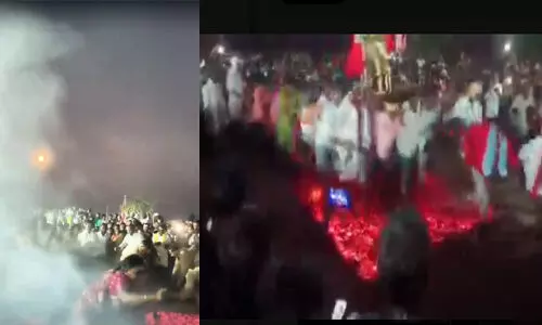 ఆమనగల్లు: నల్లగొండ జిల్లా వేములపల్లి మండలంలోని ఆమనగల్లు శ్రీపార్వతీ రామలింగేశ్వర స్వామి ఉత్సవాల్లో విషాదం చోటుచేసుకుంది. భక్తులు అగ్నిగుండం దాటుతుండగా ఒక్కసారిగా తోపులాట జరిగింది. ఒకరినొకరు నెట్టుకోవడంతో భక్తులు నిప్పుల గుండంలో పడిపోయారు. ప్రమాదంలో పదకొండు మంది భక్తులకు తీవ్రంగా గాయపడ్డారు. నిప్పుల్లో పడ్డవారిని భక్తులు, పోలీసులు బయటకు లాగారు. గాయపడిన వారిని చికిత్స నిమిత్తం హుటాహుటిన ఆసుపత్రికి తరలించారు. ఒకరినొకరు నెట్టుకోవడంతో నిప్పుల గుండంలో భక్తులు పడిపోయినట్టు సమాచారం.