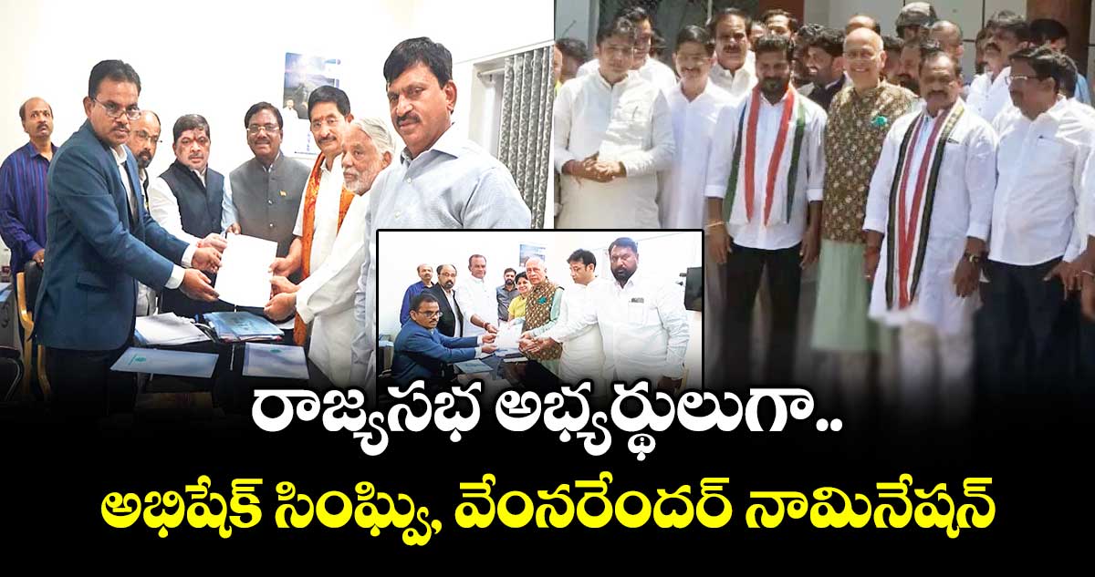 తెలంగాణ నుంచి రాజ్యసభ సభ్యులుగా కాంగ్రెస్ పార్టీ నుంచి అభిషేక్ మను సింఘ్వీ, వేం నరేందర్రెడ్డి నామినేషన్ దాఖలు చేశారు. ఎన్నికల అధికారి ఉపేందర్ రెడ్డికి నామినేషన్ పత్రాలు అందజేశారు. మంత్రులు కోమటిరెడ్డి వెంకట్ రెడ్డి, శ్రీధ ర్ బాబు నేతృత్వంలో వారిద్దరూ నామినేషన్లు వేశారు. సీఎం రేపంత్ రెడ్డి, పీసీసీ చీఫ్ మహేష్ కుమార్ గౌడ్ తో కలిసి రాజ్యసభ అభ్యర్థులు అభిషేక్ మను సింఘ్వీ, వేం నరేందర్ రెడ్డి మూడో సెట్ నామినేషన్ పత్రాలను దాఖలు
