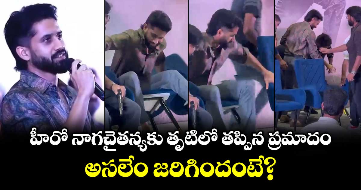 సినిమా గ్లింప్స్ లాంచ్ తర్వాత మీడియా ప్రతినిధులతో ముచ్చటించేందుకు చిత్ర యూనిట్ స్టేజీపైకి వచ్చింది. యూనిట్ సభ్యుల కోసం సిబ్బంది కుర్చీలను ఏర్పాటు చేశారు. నాగచైతన్య తనకు కేటాయించిన కుర్చీలో కూర్చోబోతుండగా, ఆ కుర్చీ ఒక్కసారిగా వెనక్కి వంగిపోయింది. బ్యాలెన్స్ తప్పడంతో చైతన్య వెనక్కి పడిపోయారు. క్షణాల్లో జరిగిన ఈ పరిణామంతో అక్కడున్న వారంతా షాక్కు గురయ్యారు. చైతన్య పడిపోతుండటాన్ని గమనించిన సెక్యూరిటీ సిబ్బంది, చిత్ర బృందం వెంటనే అప్రమత్తమై ఆయన్ని పట్టుకున్నారు. దీంతో ఆయనకు ఎలాంటి గాయాలు కాకుండా పెద్ద ప్రమాదం తప్పింది.