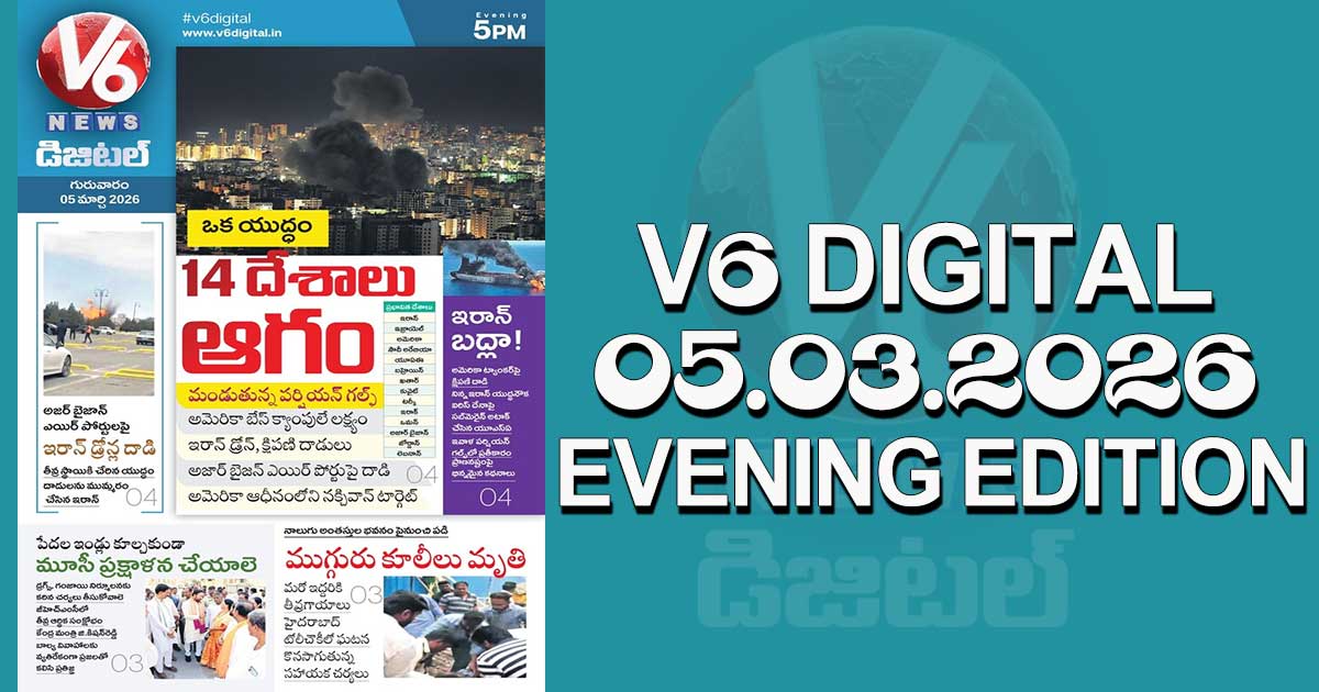 Reading Time: < 1 minute V6 DIGITAL 05.03.2026 EVENING EDITION Caption of Image. ఒక యుద్ధం.. 14 దేశాలు ఆగం..! అమెరికా చమురు నౌకపై ఇరాన్ దాడి 4 అంతస్తుల భవనంపై నుంచి పడి ముగ్గురి మృతి *ఇంకా మరెన్నో.. క్లిక్ చేయండి* Post navigation మా ఎయిర్ బేస్ లు వాడుకోండి.. యూఎస్, ఇజ్రాయెల్ కు ఫ్రాన్స్ అనుమతి రిటైర్డ్ బెనిఫిట్స్ కోసం రూ. 35 వేల లంచం..ఏసీబీకి అడ్డంగా దొరికిన జీహెచ్ఎంసీ ఉద్యోగి