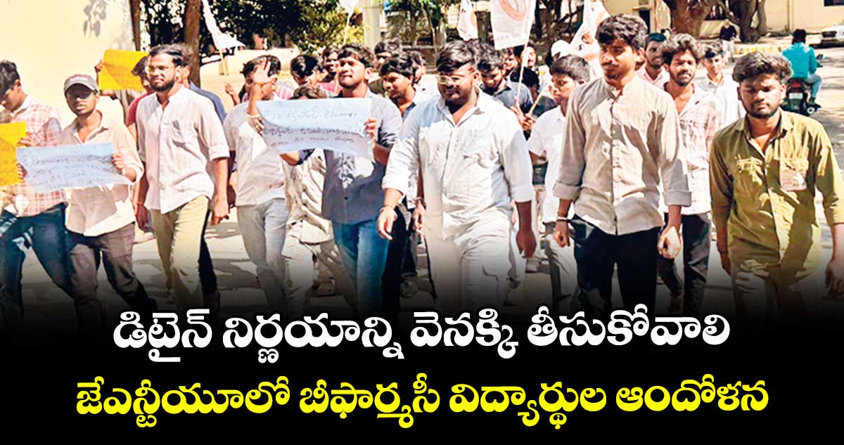 కూకట్పల్లి, వెలుగు: బీఫార్మసీ ఫైనల్ ఇయర్ విద్యార్థులను డిటైన్ చేస్తూ యాజమాన్యం తీసుకున్న నిర్ణయాన్ని వెంటనే వెనక్కి తీసుకోవాలని జేఎన్టీయూలో స్టూడెంట్ ప్రొటెక్షన్ ఫోరం ఆధ్వర్యంలో విద్యార్థులు గురువారం ఆందోళన నిర్వహించారు. 2023 ప్రొసీడింగ్స్ నిబంధనలను నాలుగో సంవత్సరం విద్యార్థులకు కూడా వర్తింపజేసి వారిని ప్రమోట్ చేయాలని ఫోరం నాయకులు జవ్వాజి దిలీప్, రాహుల్ నాయక్ డిమాండ్ చేశారు.