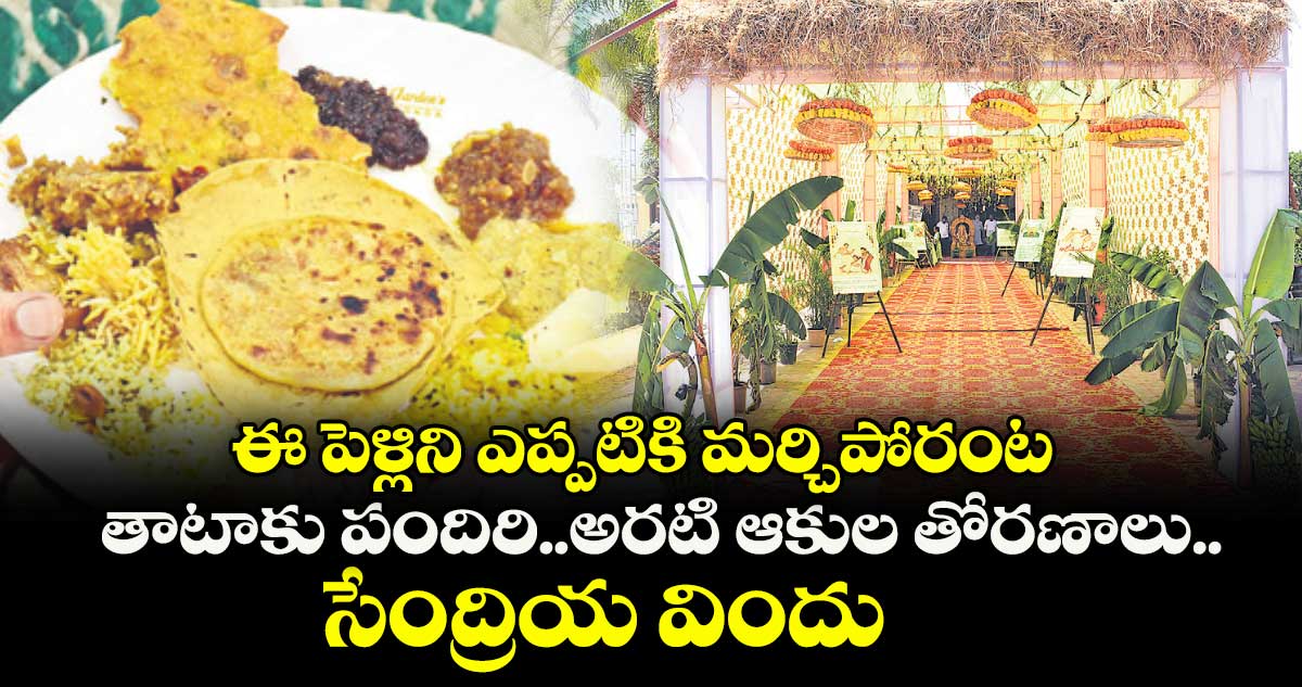 ప్రధాన ద్వారం వద్ద ఎడ్ల బండి ఇరుసులు, బంతి పూలు ఏర్పాటు చేసి, ఈతబుట్టలు, అరటి ఆకులతో తోరణాలు కట్టగా.. తాటాకులు, సహజమైన పూలతో పెండ్లి పందిరి సిద్ధం చేశారు. అలాగే విందు కోసం ‘ఆహారమే ఔషధం’ పేరుతో సేంద్రియ పద్ధతిలో సాగు చేసిన రకాలనే వాడుతూ… బూడిద గుమ్మడి హల్వా, కుంకుమ పువ్వు బియ్యంతో పులిహోరా, మైసూరు మల్లికతో కరివేపాకు రైస్, నవారా బియ్యంతో పెరుగన్నం, జొన్న రొట్టెలు, జొన్న గట్క, సర్వపిండి, సకినాలు, గుడాలు, భక్షాలు, పచ్చిపులుసు వంటి వెరైటీలను వడ్డించారు.