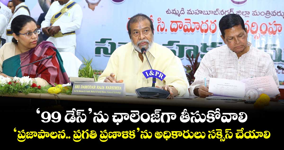 మహబూబ్ నగర్ కలెక్టరేట్/నెట్వర్క్, వెలుగు : రాష్ట్ర ప్రభుత్వం ప్రతిష్టాత్మకంగా చేపట్టిన ‘ప్రజాపాలన ప్రగతి ప్రణాళిక’ మూడో విడత కార్యక్రమాన్ని ఉమ్మడి పాలమూరు జిల్లాలో సక్సెస్ చేసేందుకు అధికారులు పక్కా కార్యాచరణతో సిద్ధం కావాలని రాష్ట్ర వైద్య ఆరోగ్య శాఖ మంత్రి, జిల్లా ఇన్చార్జి మంత్రి దామోదర రాజనర్సింహ పిలుపునిచ్చారు. మార్చి 6 నుంచి జూన్ 12 వరకు 99 రోజుల పాటు జరిగే ఈ కార్యక్రమాన్ని అధికారులు ఛాలెంజ్గా తీసుకోవాలని ఆదేశించారు. ఇది ప్రజలకు చేరువగా ఉండే ‘ఫ్రెండ్లీ ప్రభుత్వం’ అని పేర్కొన్నారు. శుక్రవారం మహబూబ్నగర్ కలెక్టరేట్లో నిర్వహించిన సన్నాహక సమావేశంలో ఆయన మాట్లాడారు.