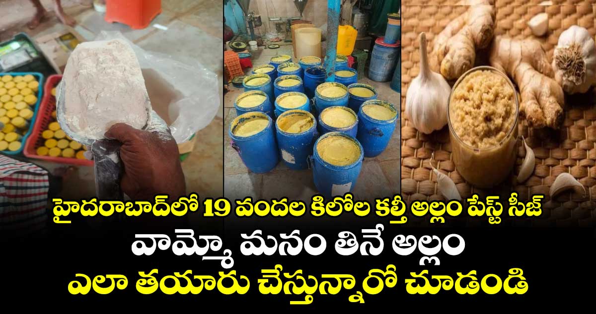 హైదరాబాద్లో రోజురోజుకు కల్తీ పెరిగిపోతుంది. ధనార్జనే లక్ష్యంగా కొందరు కల్తీ దందాకు తెరలేపుతూ ప్రజల ప్రాణాలతో చెలగాటమాడుతున్నారు. ఈ క్రమంలోనే తాజాగా హైదరాబాద్లో కల్తీ అల్లం పేస్ట్ దందా బట్టబయలైంది. గుట్టు చప్పుకుండా కల్తీ అల్లం పేస్ట్ తయారు చేస్తోన్న ముఠాను పోలీసులు అరెస్ట్ చేశారు. ఏకంగా 1900 కిలోల కల్తీ అల్లం పేస్ట్ను స్వాధీనం చేసుకున్నారు.