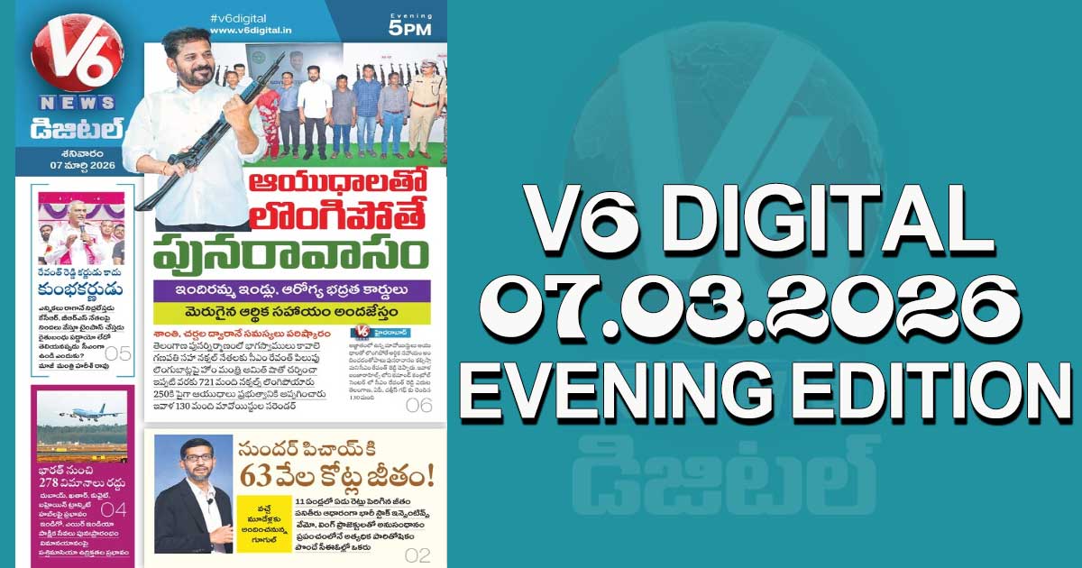 Reading Time: < 1 minute V6 DIGITAL 07.03.2026 EVENING EDITION Caption of Image. లొంగిపోయిన నక్సల్స్ కు ఆరోగ్య భద్రత కార్డులు, ఇందిరమ్మ ఇండ్లు! ఈ రాత్రికి ఇరాన్ నరకానికి పోతుందంటున్న ట్రంప్ సుందర్ పిచాయ్ కి భారీ ఇంక్రిమెంట్..! ఇప్పుడు జీతమెంతంటే? ఇంకా మరెన్నో.. క్లిక్ చేయండి Post navigation Pawan Kalyan : బాక్సాఫీస్ వద్ద ఈసారి యుద్ధమే.. ‘ఉస్తాద్ భగత్ సింగ్’ డబ్బింగ్ మొదలుపెట్టిన పవర్ స్టార్! మీ తొక్కలో పర్మిషన్ మాకు అవసరం లేదు: అమెరికాకు భారత్ కౌంటర్..!