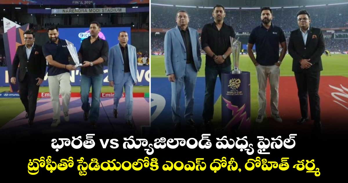 T20 World Cup: అహ్మదాబాద్లోని నరేంద్ర మోడీ స్టేడియంలో జరుగుతున్న ఐసీసీ T20 ప్రపంచ కప్ 2026 ఫైనల్కు ముందు అభిమానులను ఉత్సాహపరిచే ప్రత్యేక దృశ్యం కనిపించింది. భారత మాజీ కెప్టెన్లు మహేంద్ర సింగ్ ధోనీ, రోహిత్ శర్మ కలిసి టీ20 వరల్డ్ కప్ ట్రోఫీని స్టేడియంలోకి తీసుకువచ్చారు. వారిద్దరూ రాకను స్టేడియంలో ఉన్న అభిమానులను ఎంతో ఉత్సాహానికి గురి చేసింది. ఇద్దరు భారత క్రికెట్ దిగ్గజాలు కలిసి ట్రోఫీతో మైదానంలోకి రావడంతో ఇండియన్ క్రికెట్ ఫ్యాన్స్ ఘనంగా స్వాగతించారు.