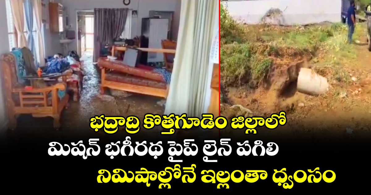 భద్రాద్రి కొత్తగూడెం: అందరూ గాఢ నిద్రలో ఉన్న సమయంలో మిషన్ భగీరథ ప్రధాన పైప్ లైన్ పగిలి ఓ ఇంట్లోకి వరద నీరు చేరిన ఘటన భద్రాద్రి కొత్త గూడెం జిల్లా పాల్వంచలో ఆదివారం (మార్చి 8) అర్ధరాత్రి చోటుచేసుకుంది. వివరాల ప్రకారం.. పాల్వంచ మండలం తోగ్గూడెంలోని మిషన్ భగీరథ గ్రిడ్ నుంచి తాగునీరు సరఫరా అయ్యే ప్రధాన పైప్ లైన్ పాల్వంచ బసవతారక కాలనీ మీదుగా వెళుతోంది. పాక్షికంగా ఈ పైపు లైన్ పగలగా సమీపంలోని రైతు హున్నాలాల్ టమాటా తోట నీట మునిగింది.