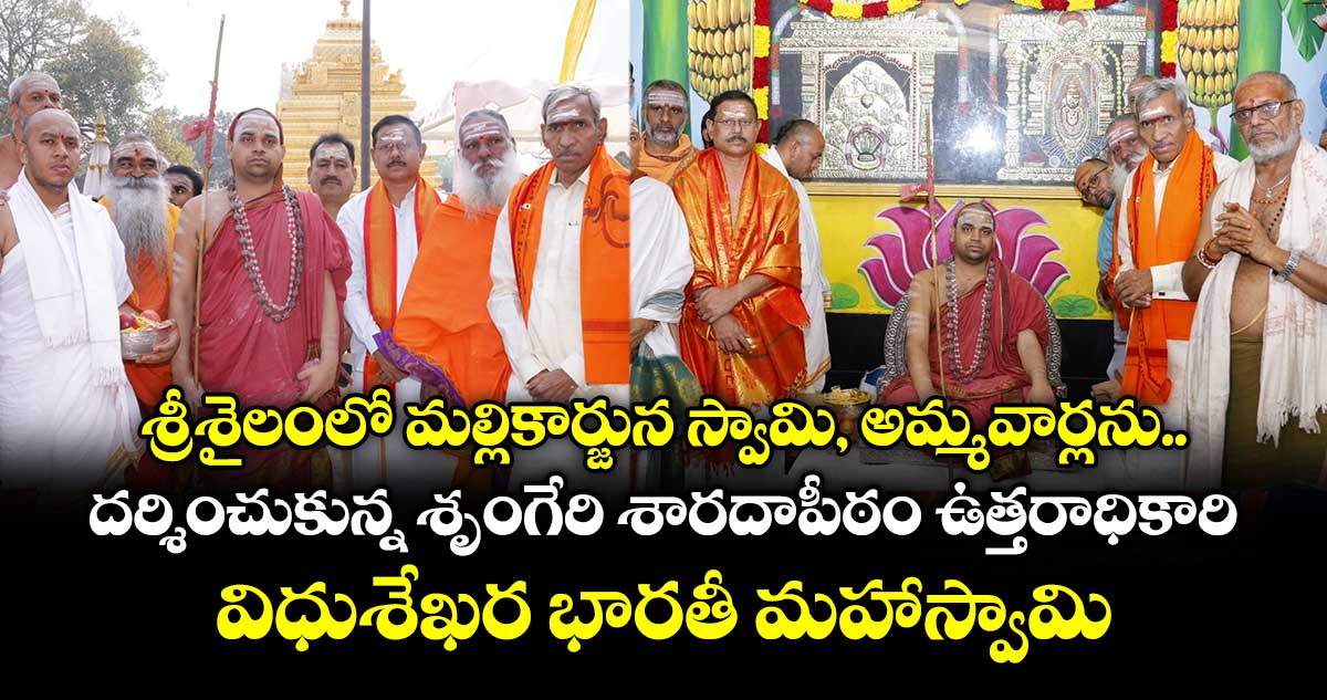 శ్రీశైలంలో మల్లికార్జున స్వామి, భ్రమరాంబిక అమ్మవార్లను దర్శించుకున్నారు శృంగేరి శారదాపీఠం ఉత్తరాధికారి విధుశేఖర భారతీ మహాస్వామి. సోమవారం ( మార్చి 9 ) ఆలయానికి విచ్చేసిన ఆయన స్వామి, అమ్మవార్లను దర్శించుకున్నారు. ఇవాళ ఉదయం ఆలయం దగ్గరికి చేరుకున్న పీఠాధిపతికి సంప్రదాయాన్ని అనుసరించి రాజగోపురం దగ్గర పూర్ణకుంభంతో స్వాగతం పలికారు కార్యనిర్వహణాధికారి శ్రీనివాసరావు, ధర్మకర్తల మండలి సభ్యులు, అర్చకస్వాములు, వేదపండితలు, అధికారులు.