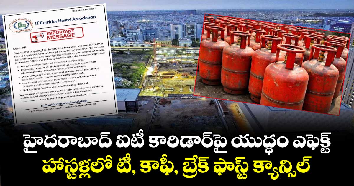 హైదరాబాద్: ఇజ్రాయెల్-అమెరికా, ఇరాన్ యుద్ధ ప్రభావం హైదరాబాద్ ఐటీ కారిడార్పై పడింది. పశ్చిమాసియా ఇంధన సంక్షోభంతో భారత్లో ఎల్పీజీ కొరత ఏర్పడటంతో కేంద్ర ప్రభుత్వం కమర్షియల్ సిలిండర్లపై కోత విధించింది. గ్యాస్ సిలిండర్ల కొరత నేపథ్యంలో హైదరాబాద్ ఐటీ కారిడార్ హాస్టల్ అసోసియేషన్ కీలక నిర్ణయం తీసుకుంది.