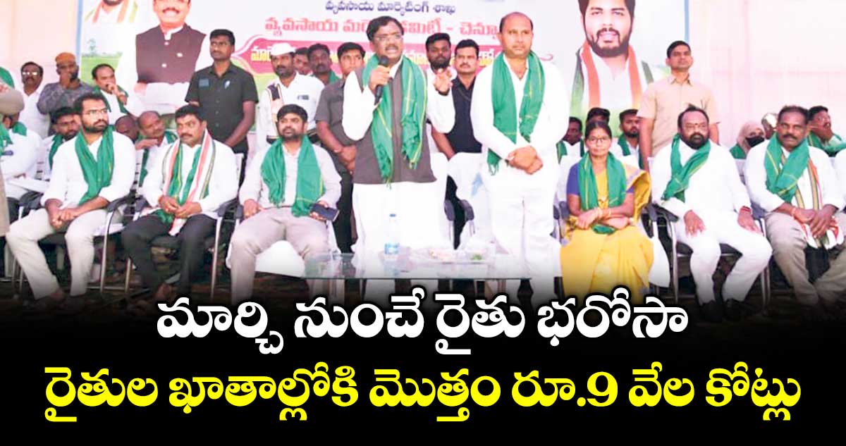 కోల్ బెల్ట్/కోటపల్లి: రైతు భరోసా నిధులు మార్చి నుంచే ఇవ్వనున్నట్లు కార్మిక, ఉపాధి కల్పన శాఖ మంత్రి వివేక్ వెంకటస్వామి తెలిపారు. మొత్తం రైతుల ఖాతాల్లో రూ.9 వేల కోట్లు జమ చేస్తామని చెప్పారు. మంచిర్యాల జిల్లా చెన్నూరు వ్యవసాయ మార్కెట్ పాలకవర్గం ప్రమాణ స్వీకారానికి ముఖ్య అతిథిగా హాజరయ్యారు. చైర్మన్ గా మహేశ్ ప్రసాద్ తివారీ, వైస్ చైర్మన్ పాపిరెడ్డి, మరికొందరు డైరెక్టర్లుగా ప్రమాణం చేశారు.