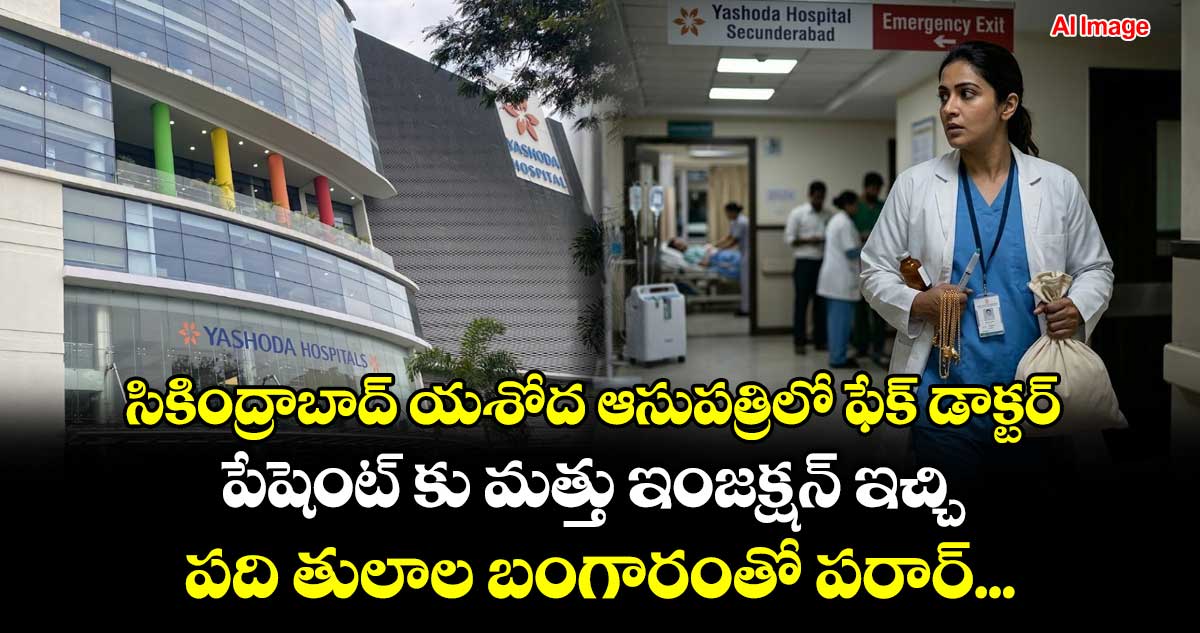 సికింద్రాబాద్ యశోద ఆసుపత్రిలో నకిలీ డాక్టర్ హల్ చల్ చేసింది. పేషెంట్ కు ట్రీట్మెంట్ ఇవ్వలంటూ రూంలోకి వచ్చిన యాప్రాన్ వెసుకున్న ఓ మహిళ..వారి కుటుంబీకులందరిని బయటకు పంపి,పేషేంట్ కు స్పృహ లేకుండా చెసి పది తులాల బంగారం తో ఉడాయించింది. దీంతో విషయం గమనించిన పేషేంట్ బంధువులు ఆసుపత్రి యజమన్యనికి ఫిర్యాదు చెయగా..వచ్చిందేవరో తమకు తెలియదని చెప్పారు యాజమాన్యం.