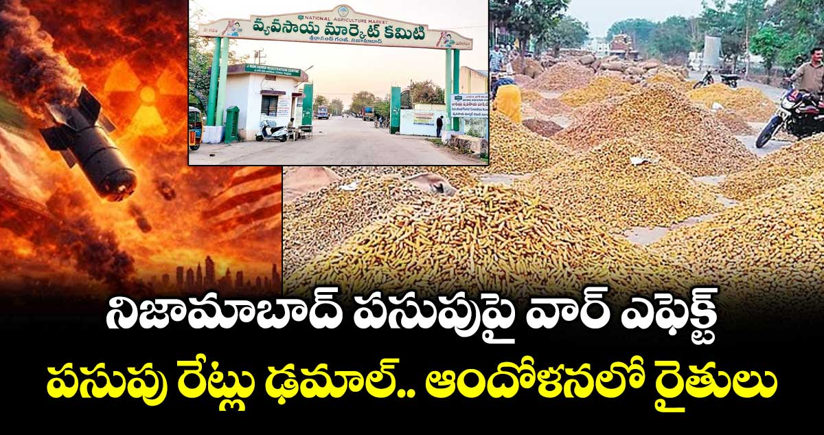 ఇరాన్ యుద్ధం కారణంగా పలు గల్ఫ్ దేశాలకు నిజామాబాద్ పసుపు ఎగుమతి నిలిచిపోయింది.10 రోజులుగా ఎగుమతులు నిలిచిపోవడంతో మార్కెట్లోనే పసుపు రైతులు పడిగాపులు గాస్తున్నారు. దీంతో పసుపు రేట్లు అమాంతం పడిపోయాయి. యుద్దానికి ముందు క్వింటాల్ రూ.14 వేలు ఉన్న పసుపు రేటు ఇపుడు రూ. 10 వేల దిగువకు పడిపోయింది. యుద్ధం సాకుతో వ్యాపారులు సిండికేటై పసుపు రేటును తగ్గించేశారు. దీంతో గిట్టుబాటు ధర ఇప్పించాలని పసుపు రైతులు డిమాండ్ చేస్తున్నారు. నిజామాబాద్ జిల్లా వ్యవసాయ మర్కెట్ యార్డుకు రోజుకు దాదాపు 20 వేల బస్తాల పసుపు వస్తుంది. పశ్చిమాసియాలో యుద్ద వాతారణం కారణంగా ఎగుమతులు నిలిచిపోవడంతో అమాంతం రేట్లు ఢమాల్ అయ్యాయి.