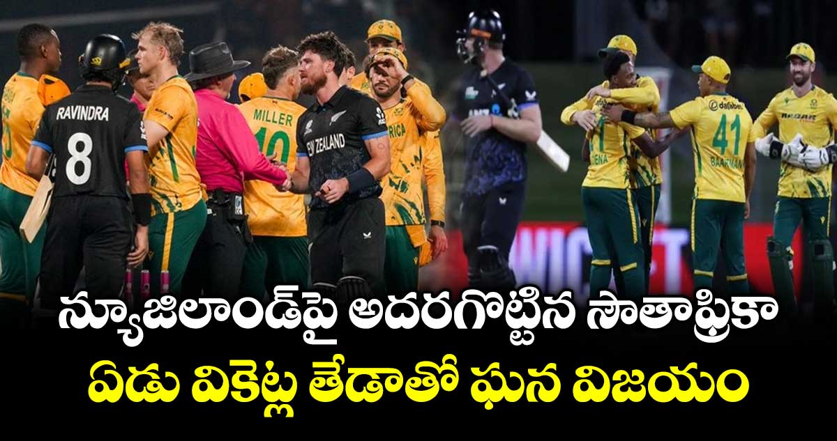 SA vs NZ: న్యూజిలాండ్ టూర్ ని సౌతాఫ్రికా ఘనంగా ప్రారంభించింది. మౌంట్ మంగునూయ్ వేదికగా జరిగిన తొలి టీ20లో కివీస్ పై ఏకంగా 7 వికెట్ల తేడాతో దక్షిణాఫ్రికా గ్రాండ్ విక్టరీ సాధించింది. దీంతో ఐదు మ్యాచుల సిరీస్ లో ప్రోటీస్ 1–-0 ఆధిక్యంలోకి దూసుకెళ్లింది. ఐడెన్ మార్క్రమ్, క్వింటన్ డికాక్, కగిసో రబాడ, లుండి ఎంగిడి లాంటి సీనియర్లు లేనిప్పటికి.. కేశవ్ మహారాజ్ కెప్టెన్సీలో సఫారీ యంగ్ టీమ్ అద్భుతంగా రాణించింది. ఈ మ్యాచులో మొదట బ్యాటింగ్ చేసిన న్యూజిలాండ్ 14.3 ఓవర్లలో కేవలం 91 రన్స్ చేసి ఆలౌట్ అయింది. ప్రోటీస్ బౌలర్ల ధాటికి కివీస్ బ్యాటర్లు విలవిల్లాడారు.