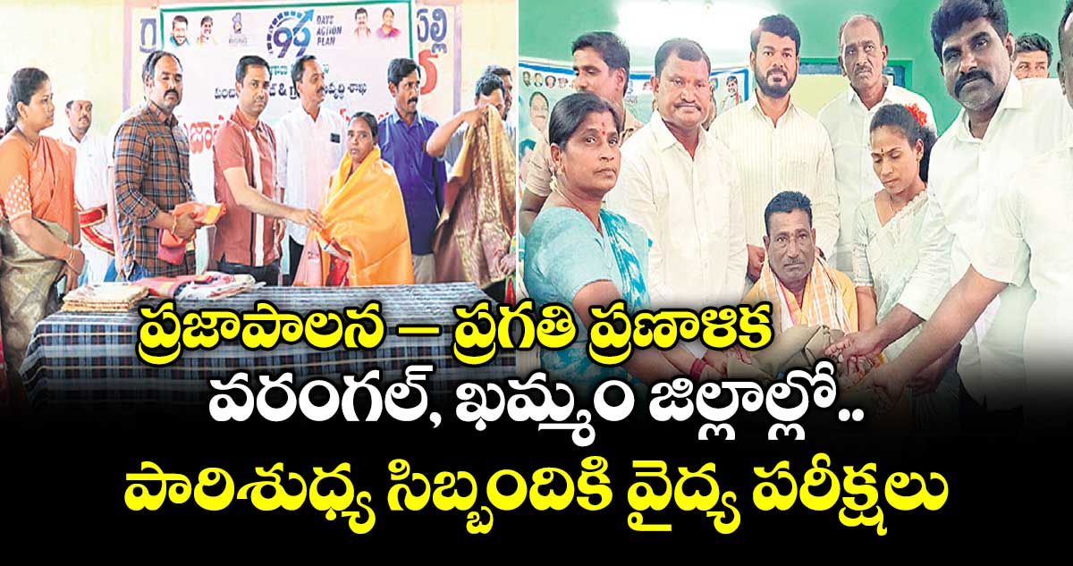 జనగామ/ ములుగు/ ములకలపల్లి/ రేగొండ/ వైరా, వెలుగు: రాష్ట్ర ప్రభుత్వం చేపట్టిన ప్రజాపాలన– ప్రగతి ప్రణాళిక కార్యక్రమంలో భాగంగా ఉమ్మడి వరంగల్, ఖమ్మం జిల్లాల్లో ఆదివారం వైద్య శిబిరాలను ఏర్పాటు చేసి పారిశుధ్య సిబ్బందికి ఆరోగ్య పరీక్షలు నిర్వహించారు. పలుచోట్ల పారిశుధ్య కార్మికులను సన్మానించారు. జనగామ జిల్లాలో ఏర్పాటు చేసిన వైద్య శిబిరాల్లో మొత్తం 1986 మంది కార్మికులకు పరీక్షలు నిర్వహించి, అవసరమైన వారిని ఆస్పత్రికి రెఫర్ చేసినట్లు డీఎంహెచ్వో మల్లికార్జున్రావు తెలిపారు.