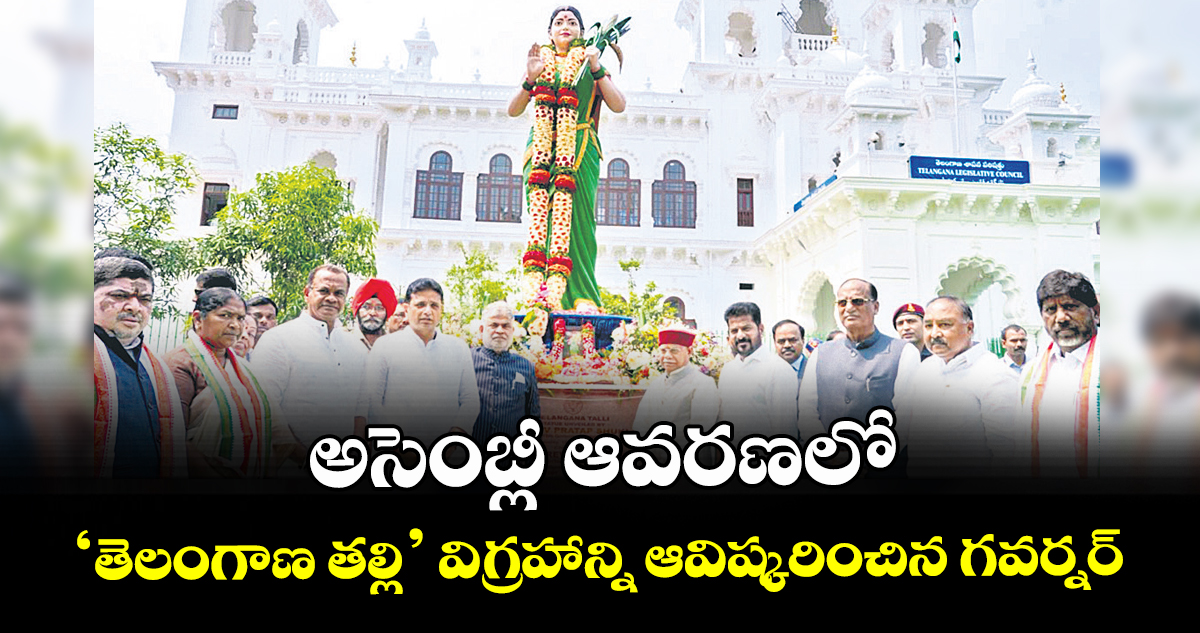 అసెంబ్లీ ఆవరణలో తెలంగాణ తల్లి విగ్రహాన్ని గవర్నర్ శివ ప్రతాప్ శుక్లా ఆవిష్కరించారు.ఈ కార్యక్రమంలో సీఎం రేవంత్రెడ్డి, మండలి చైర్మన్ గుత్తా సుఖేందర్రెడ్డి, శాసనసభ స్పీకర్ గడ్డం ప్రసాద్ కుమార్, డిప్యూటీ సీఎం భట్టి విక్రమార్కతో పాటు పలువురు మంత్రులు, ఎమ్మెల్యేలు పాల్గొన్నారు. అంతకుముందు ప్రాంగణంలో ఉన్న గాంధీ, అంబేద్కర్ విగ్రహాలకు గవర్నర్ నివాళి అర్పించారు.