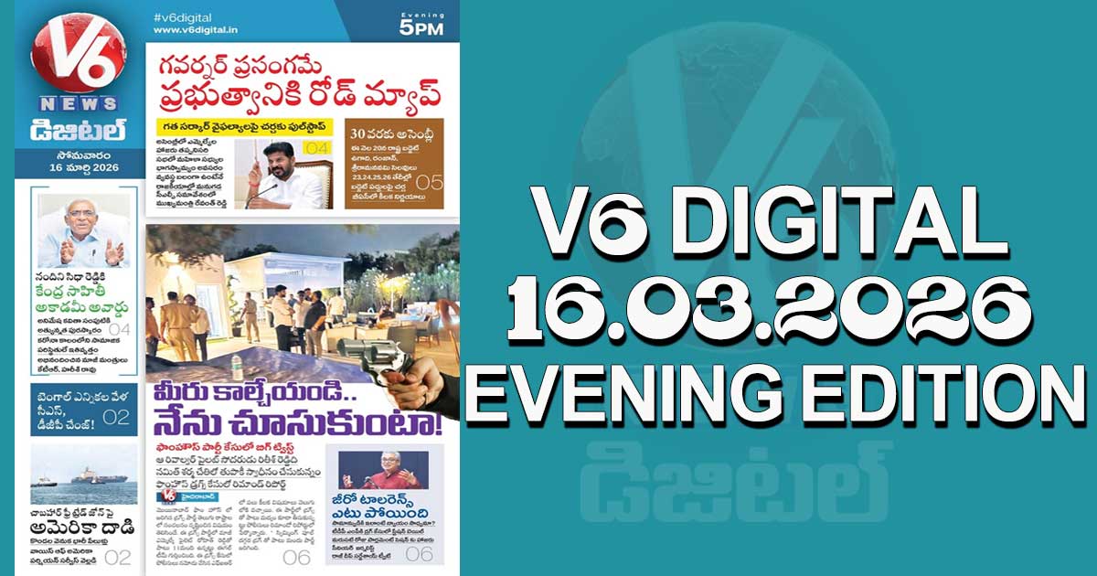Reading Time: < 1 minute V6 DIGITAL 16.03.2026 EVENING EDITION Caption of Image. గవర్నర్ ప్రసంగమే రోడ్ మ్యాప్ అంటున్న సీఎం రేవంత్ ఫాంహౌస్ డ్రగ్స్ కేసు.. కాల్చేయండి..నేను చూసుకుంటా! ఎవరన్నారు? నందిని సిధారెడ్డికి కేంద్ర సాహితీ అకాడమీ పురస్కారం ఇంకా మరెన్నో.. క్లిక్ చేయండి Post navigation RGV: మళ్లీ ఫామ్ లోకి రామ్ గోపాల్ వర్మ.. ‘సర్కార్ 4’ అనౌన్స్తో సినీ ఇండస్ట్రీ షేక్! ICC Player of the Month: వరల్డ్ కప్ గెలిచిన భారత్.. ఐసీసీ ప్లేయర్ ఆఫ్ ది మంత్ లిస్టులో లేని ఇండియన్ ప్లేయర్స్