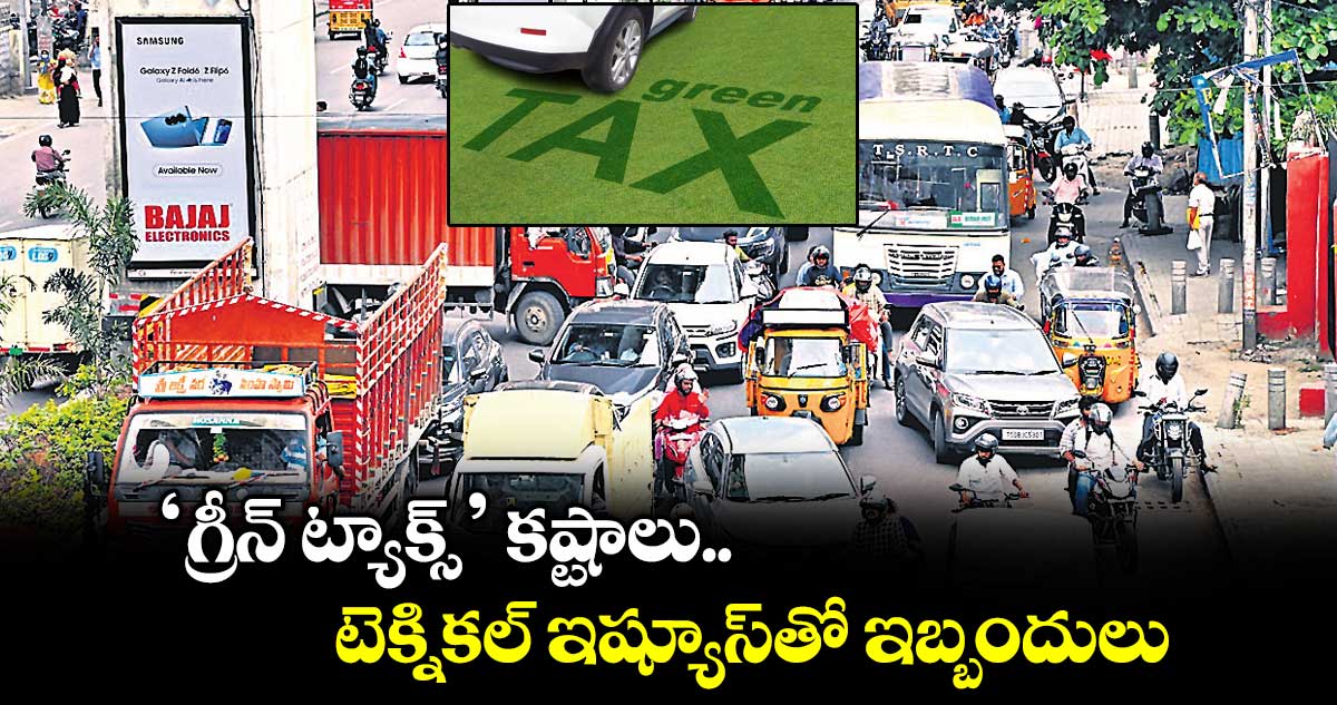 ఆర్టీఏ వెబ్సైట్లో స్లాట్ బుక్ కావడం లేదు. అదృష్టవశాత్తు స్లాట్బుక్ అయినా డబ్బులు కడదామంటే ఓటీపీ రావడం లేదు. కొందరికి పేమెంట్గేట్వేలు నిలిచిపోయి రోజుల తరబడి ఎదురుచూడాల్సి వస్తున్నది. మీ సేవా కేంద్రాల్లోనూ గ్రీన్ ట్యాక్స్ఆప్షన్స్ రావడం లేదు. పలు సెంటర్లలో సర్వర్డౌన్ కావడమో లేక డేటా నాట్ ఫౌండ్ అనో వస్తోంది. ఈ విషయమై ఆర్టీఏ అధికారులను సంప్రదిస్తే సాంకేతి సమస్యలను సరిచేస్తున్నట్టు చెప్తున్నారు. ఈ సేవా కేంద్రాల్లో మాత్రం సర్వర్ డౌన్ కావడం, సాంకేతిక సమస్యలకు తమకు సంబంధం లేదని చెప్తున్నారు.