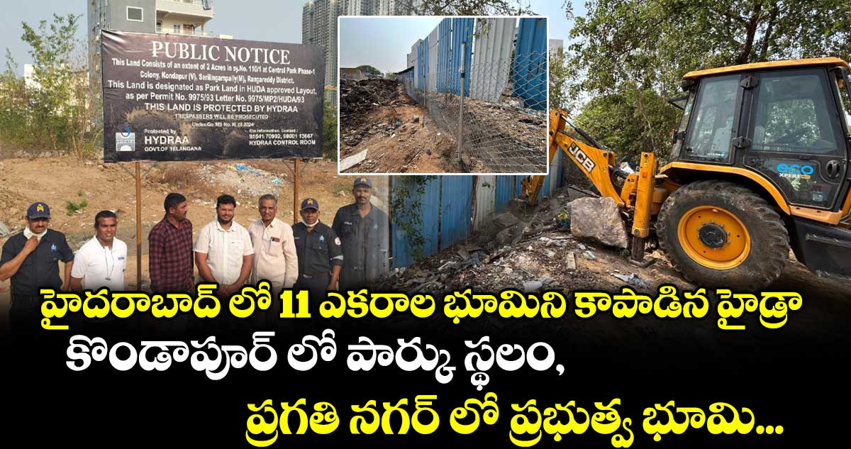 హైదరాబాద్ లో 11 ఎకరాల భూమిని కబ్జా చెర నుంచి కాపాడింది హైడ్రా. కొండాపూర్, ప్రగతి నగర్ లో పార్కు, డంప్ యార్డు, శ్మశానవాటిక భూముల్లో ఆక్రమణలు తొలగించింది. హైడ్రా కాపాడిన మొత్తం భూముల విలువ రూ. 16 వందల 50 కోట్లు ఉంటుందని అంచనా వేశారు హైడ్రా అధికారులు. ప్రజావాణిలో వచ్చిన ఫిర్యాదుల మేరకు రంగంలోకి దిగిన హైడ్రా అధికారులు మంగళవారం ( మార్చి 17 ) ఆక్రమణల తొలగింపు చేపట్టారు.