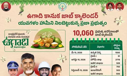 అమరావతి: ఆంధ్రప్రదేశ్ యువతకు కూటమి ప్రభుత్వం ఉగాది పండుగ రోజున జాబ్ క్యాలెండర్ ను విడుదల చేయనుంది. యువగళం పాదయత్రలో మంత్రి నారా లోకేష్ హామీ ఇచ్చిన ప్రకారం ఉగాదిని పురస్కరించుకున్న సందర్భంగా గురువారం జాబ్ క్యాలెండర్ విడుదల చేయనున్నారు. కూటమి ప్రభుత్వం 10,060 పోస్టులతో జాబ్ క్యాలెండర్ విడుదల చేయనుంది. ఇప్పటికే మెగా డీఎస్సీ ద్వారా 16వేల ఉపాధ్యాయుల పోస్టులు, 6 వేల కానిస్టేబుల్ పోస్టులు, వివిధ ప్రభుత్వ శాఖల్లో 9 వేల పోస్టులను కూటమి ప్రభుత్వం భర్తీ చేసిన విషయం తెలిసిందే.