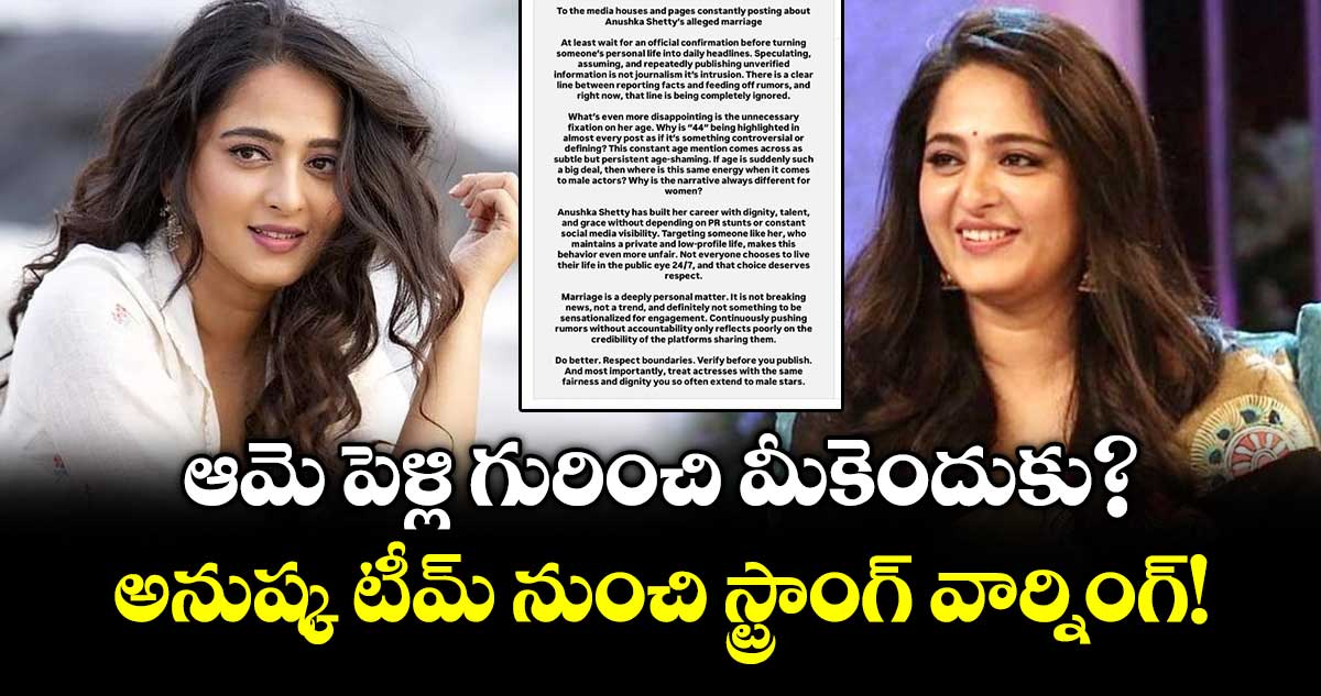 టాలీవుడ్ స్వీటీ అనుష్క శెట్టి వ్యక్తిగత జీవితంపై నిత్యం సోషల్ మీడియాలో ఏదో ఒక వార్త చక్కర్లు కొడుతూనే ఉంటుంది. ముఖ్యంగా ఆమె వివాహం గురించి గత దశాబ్ద కాలంగా వందల సంఖ్యలో కథనాలు వచ్చాయి. తాజాగా, అనుష్క ఒక వ్యాపారవేత్తను వివాహం చేసుకోబోతోందంటూ నెట్టింట మరోసారి జోరుగా ప్రచారం మొదలైంది. అయితే, ఈసారి ఈ పుకార్లపై అనుష్క టీమ్ చాలా సీరియస్ గా వార్నింగ్ ఇచ్చింది.