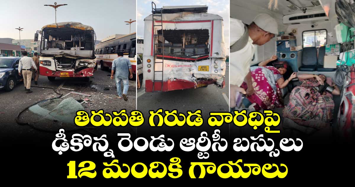 తిరుమల: తిరుపతి గరుడ వారధిపై రోడ్డు ప్రమాదం జరిగింది. ముందు వెళ్తున్న ఆర్టీసీ బస్ను మరో ఆర్టీసీ బస్ వెనక నుంచి ఢీకొట్టింది. ఈ ప్రమాదంలో 12 మంది ప్రయాణికులు స్వల్పంగా గాయపడ్డారు. సమాచారం అందుకున్న పోలీసులు, ఆర్టీసీ అధికారులు సంఘటనా స్థలానికి చేరుకుని సహయక చర్యలు చేపట్టారు. క్షత్రగాత్రులను హుటాహుటిన రుయా ఆస్పత్రికి తరలించారు.