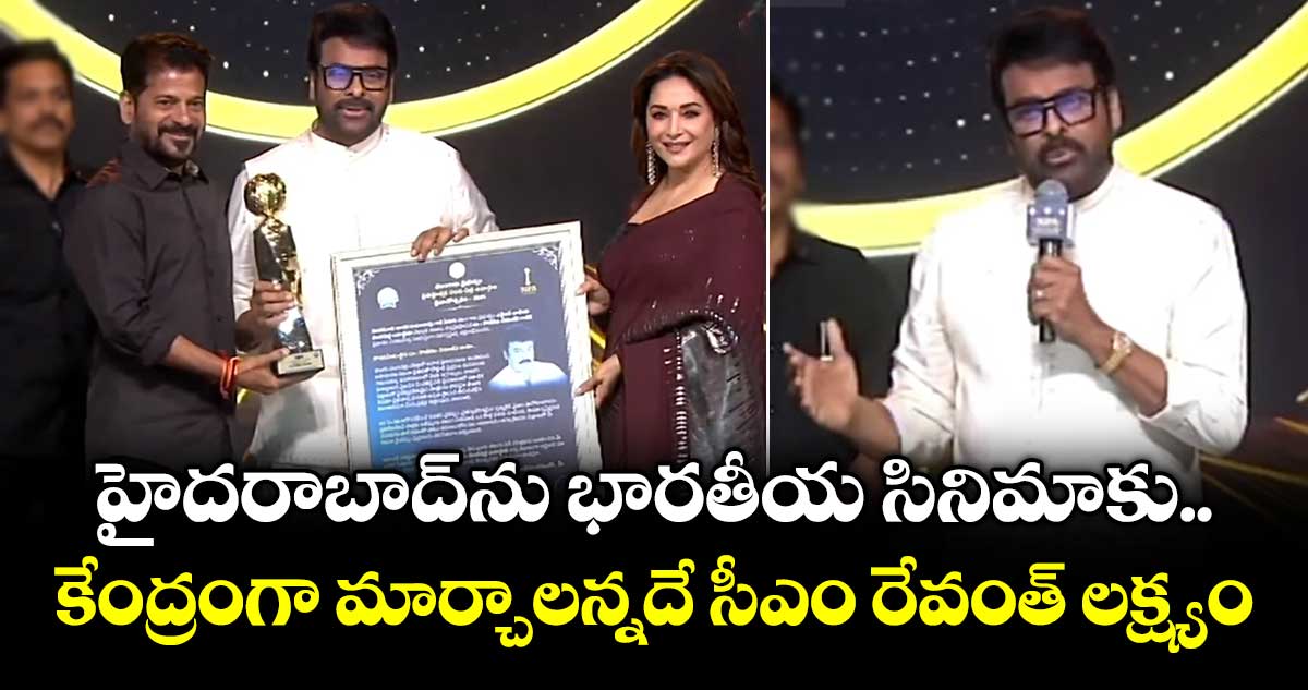 హైదరాబాద్: హైదరాబాద్ను భారతీయ సినిమాకు కేంద్రంగా మార్చాలన్నదే సీఎం రేవంత్ లక్ష్యమని మెగాస్టార్ చిరంజీవి అన్నారు. గురువారం (మార్చి 19) హైటెక్స్లో జరిగిన గద్దర్ అవార్డ్స్ వేడుకలో సీఎం రేవంత్ రెడ్డి చేతుల మీదుగా చిరంజీవి ఎన్టీఆర్ నేషనల్ ఫిల్మ్ అవార్డును అందుకున్నారు.